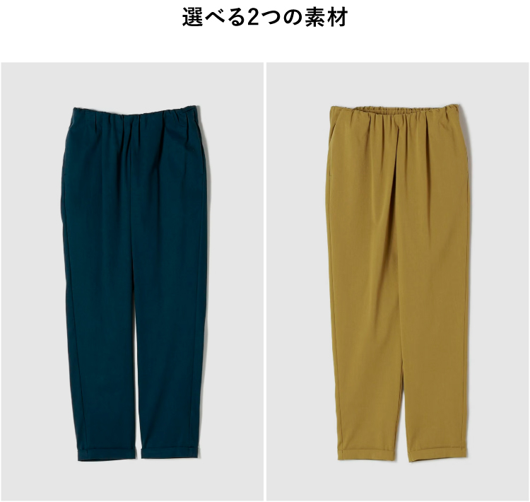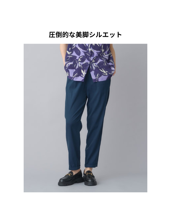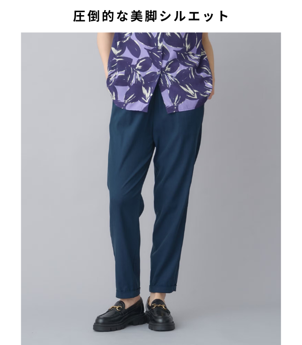 脚先に向かって細くなるテーパードシルエットが、すっきりとした印象を演出。