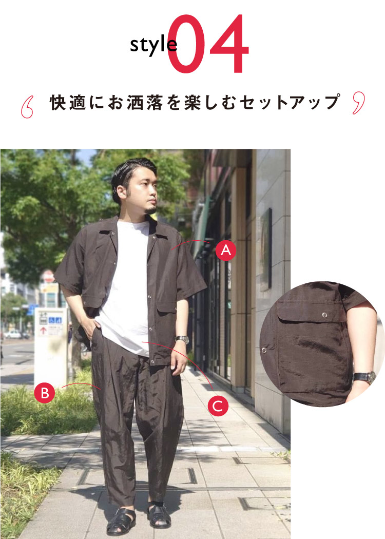 シャリ感と光沢のある平織り生地で、非常に軽く涼しく、大人の夏のコーディネートに最適なセットアップ。