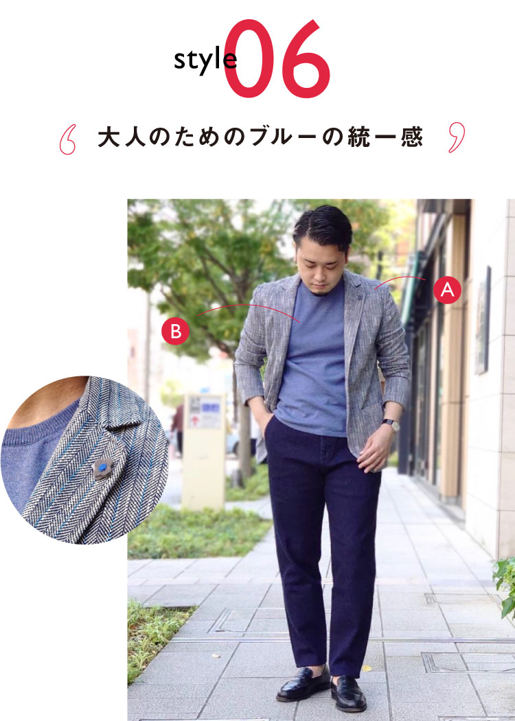 ペンシルストライプの色を拾い、発色の良いブルーのコットンニットを合わせ、爽やかな印象のコーディネートに。