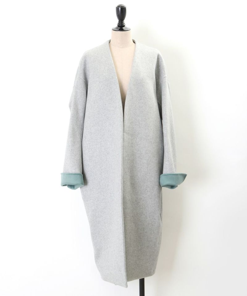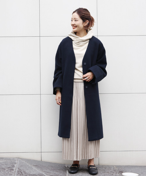 フーデッドのトップスに同色のプリーツスカートを合わせて、カジュアルなコーディネートをリュクスに格上げ。ノーカラーコートのミニマルなデザインが、大人のカジュアルコーデにマッチ。PARIGOTのドロップショルダーノーカラーコートは、ゆとりのあるサイジングでスウェットやニットなどの上から羽織れるのが嬉しい。