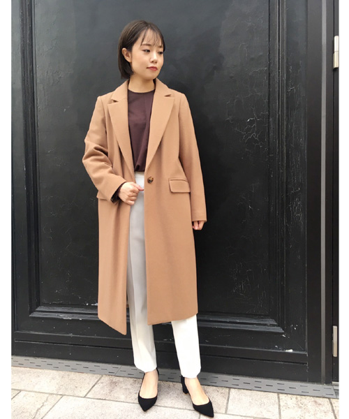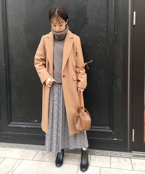 キャメルにはブラウンを合わせて、トレンド感のある同系色のコーディネートが◎。バランスよく着こなす鍵は、トップスをインするなど自分の体型に合わせたひと工夫。店頭にてそのバランス感を伝授いたしますので、ぜひお気軽にご質問くださいね。