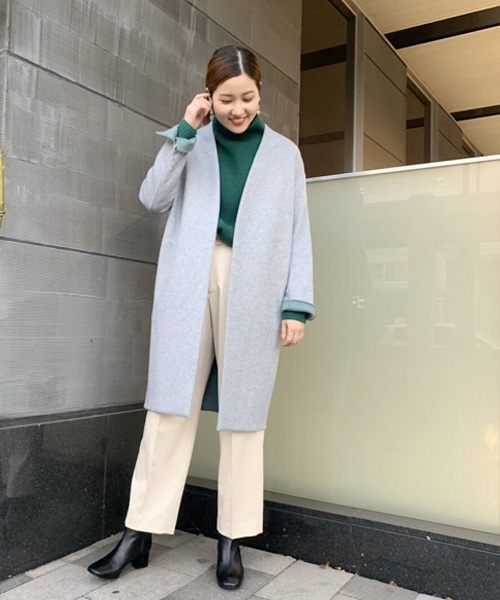 11月は肌を覗かせていた華奢な部分を隠すと一気に温かみのある装いに。インナーには温かみのあるハイネックニットをチョイス。美しいラインを描くノーカラーコートだからこそ、首元のレイヤードを楽しんで。手首からはニットのカラーをのぞかせて遊び心をプラス。足下はブーツをオンすることでシーズンらしさが一気に漂います。