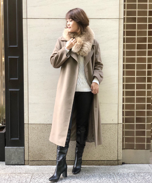首元のファーが目線をアップし、ブラックデニムとロングブーツのコンビが脚をすらっと美しく見せてくれる、スタイルアップ効果抜群のコーディネート。Iラインの協調されるロングコートだからこそ、こういったコーディネートを楽しみたいですよね。1点1点上質なアイテムだからこそ漂う品格と、凛とした佇まいが魅力。