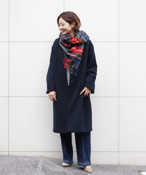Johnstonsの大判カシミヤストールをラフに巻いて、スッキリとしたノーカラーコートの首元に華やかさを添えて。ケーブルニット×デニムのカジュアルコーデも、コートのシルエットやクラス感のある小物使いで洗練されたムードに。