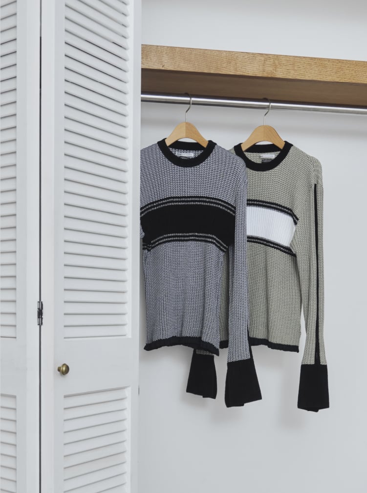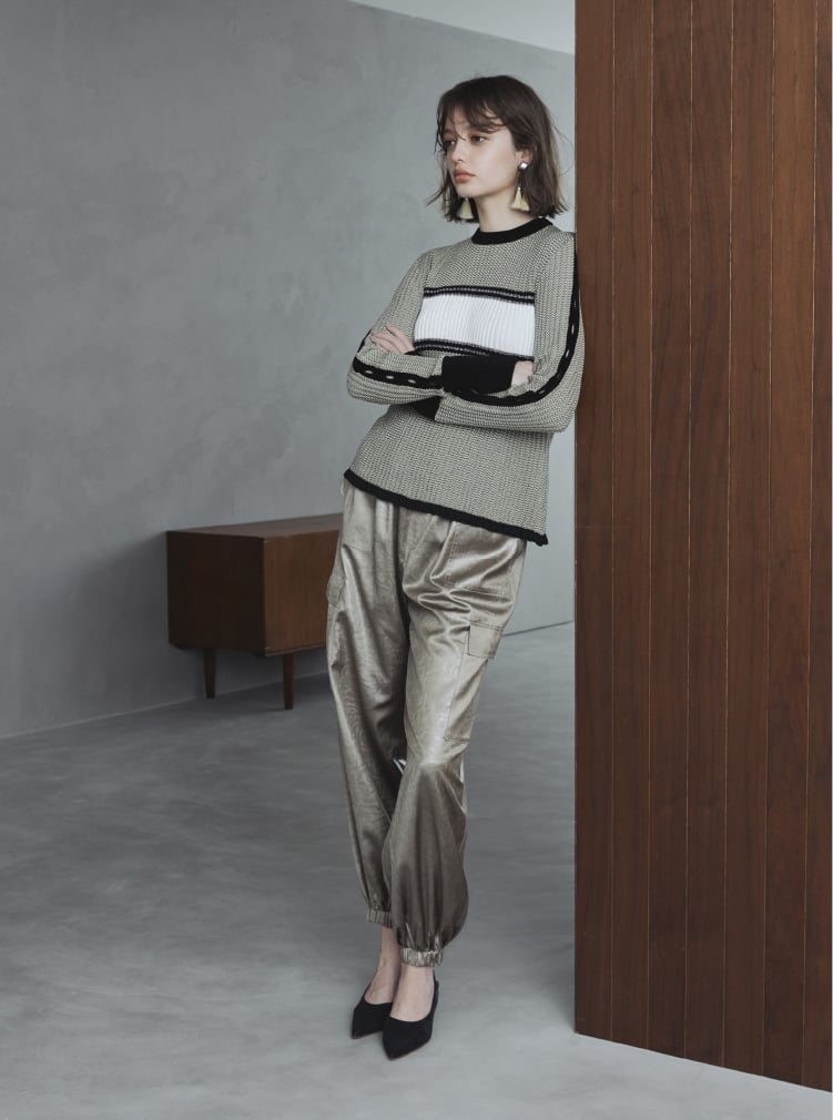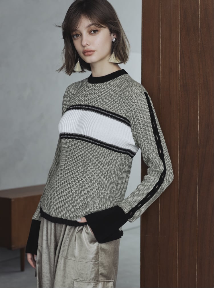 エジプトコットンをメインに、ニットの編み技術を駆使したアイテム。イタリアメーカーの卓越した技術で、毛玉が出来にくい上質素材を使用。ゆったりとしたリブ編みに仕上げ、アクセントに異素材のモール糸やビスコース、ラメ素材をミックス。 さらに袖はフレアのカフス開きで、袖脇のラインは穴開きの編地で表現しています。