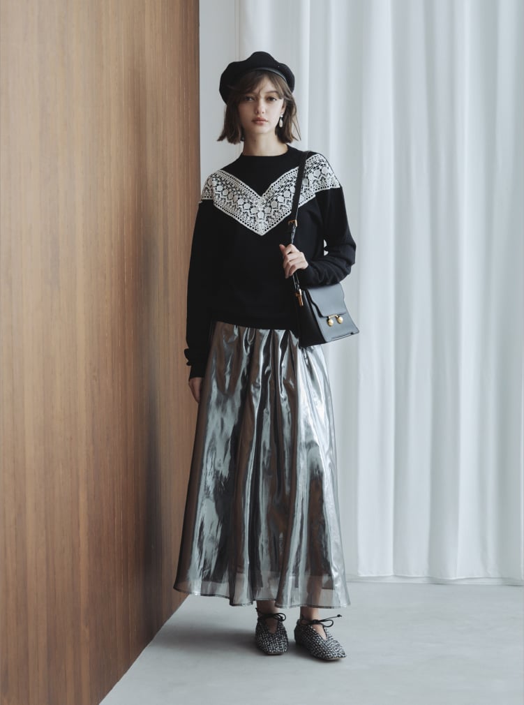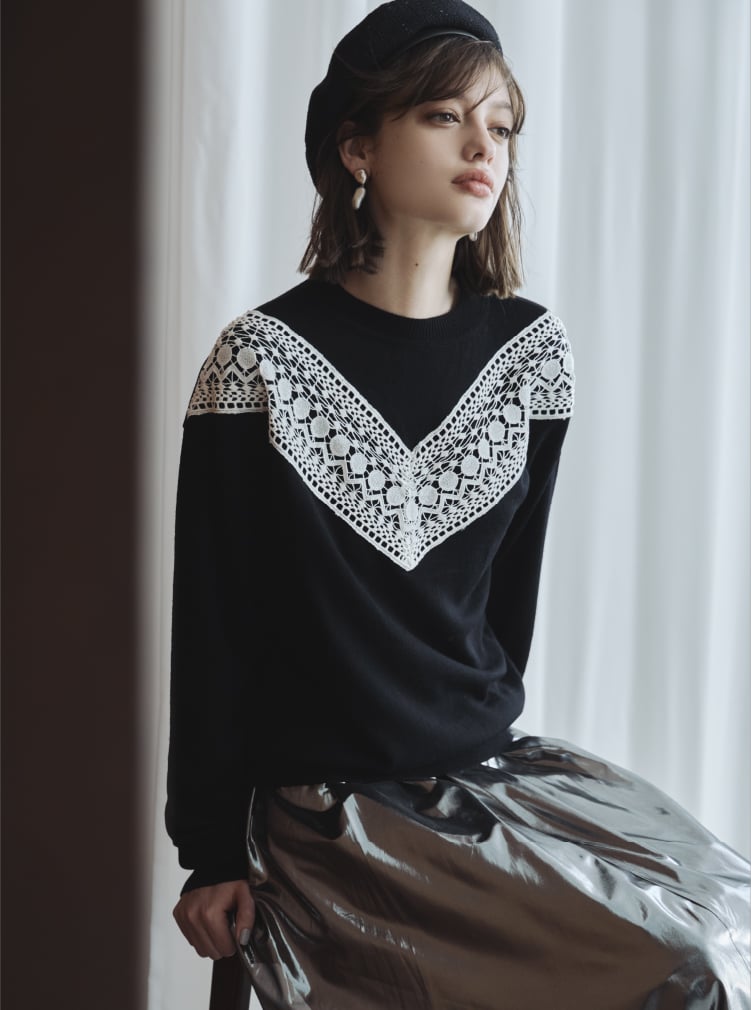 シンプルな身頃にケミカルレースを施したハイゲージニット。厳選された豪州メリノウールを使用。オフスケール加工によりソフトな風合いと豊かな発色性・ふくらみ感を持たせたイタリアンテイストのニット糸となります。ニットとレースのバイカラーが印象的でコーディネートのアクセントになる1着です。