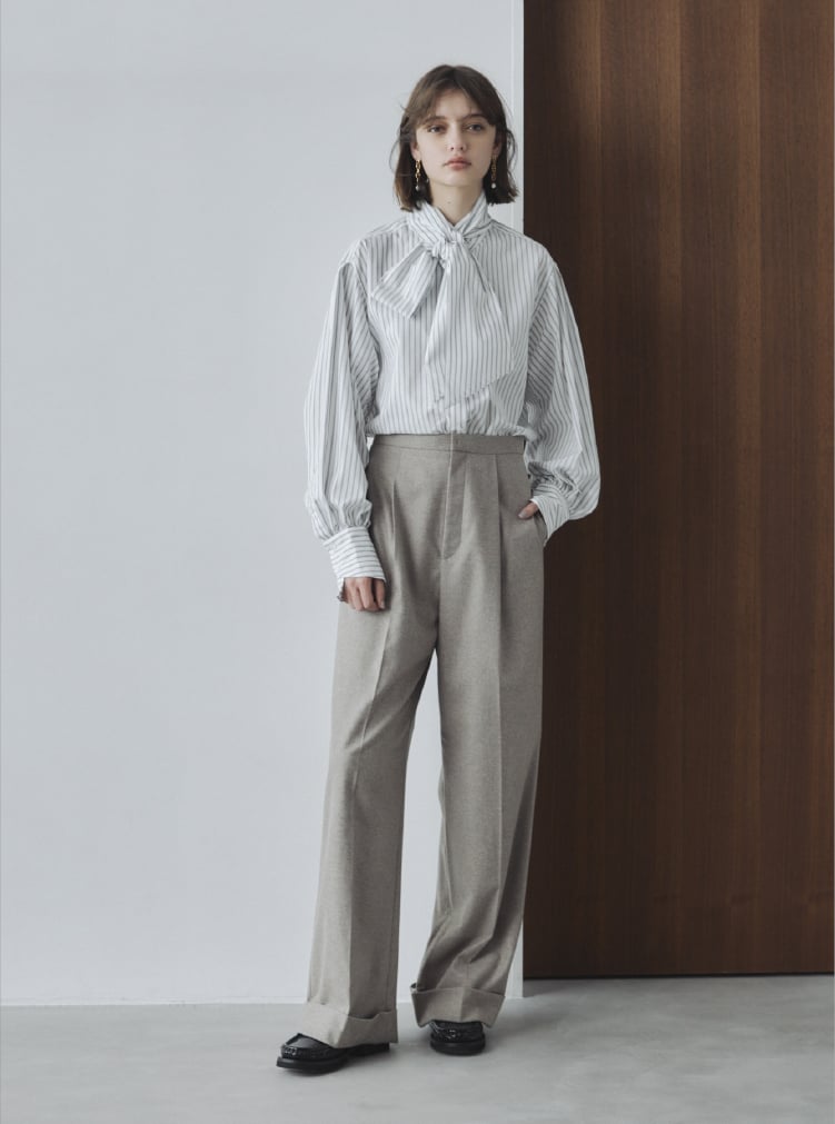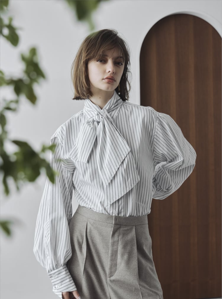 コンパクトな身頃デザインと袖のコントラストが印象的なボウタイブラウス。袖にタックとギャザーを入れ、スリーブコンシャスなシルエットを表現。袖口の変形カフスがアクセントに。ボウタイは取外しできるため、スタイリングに合わせて楽しめます。