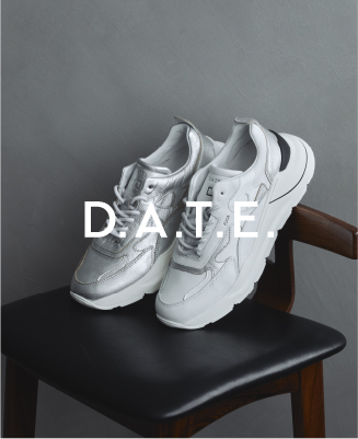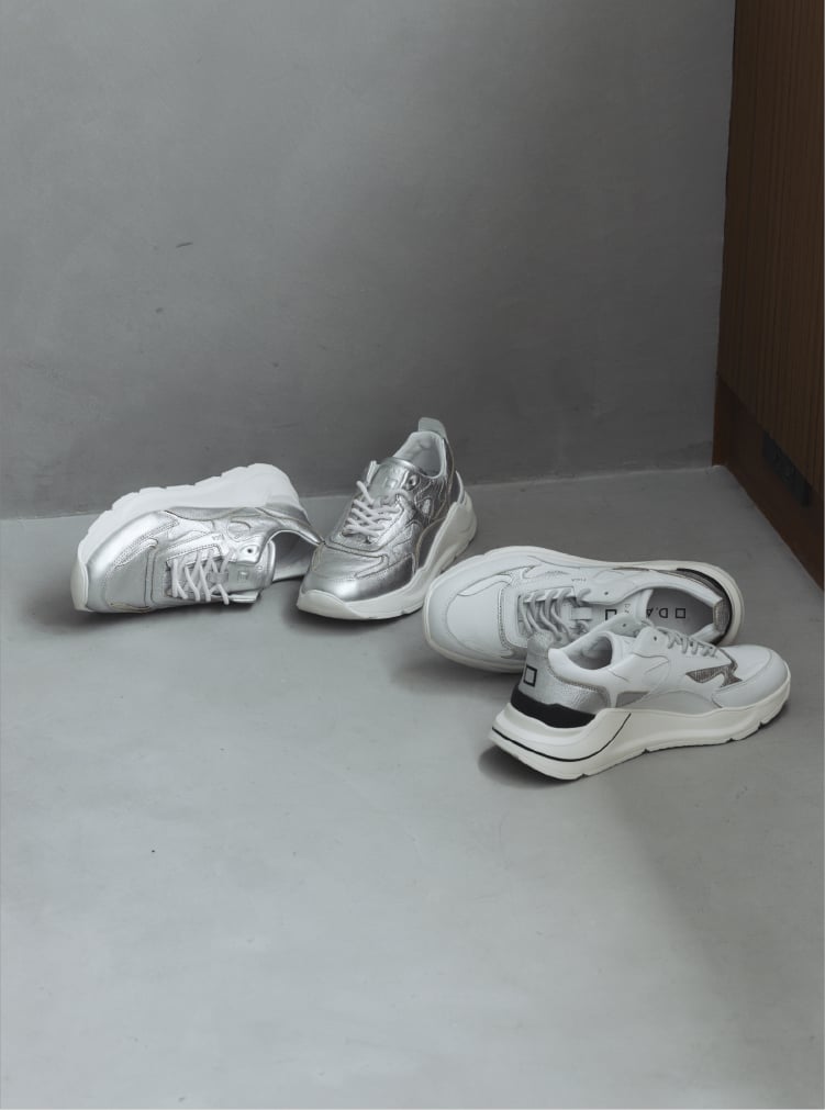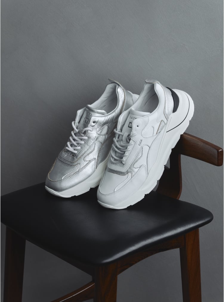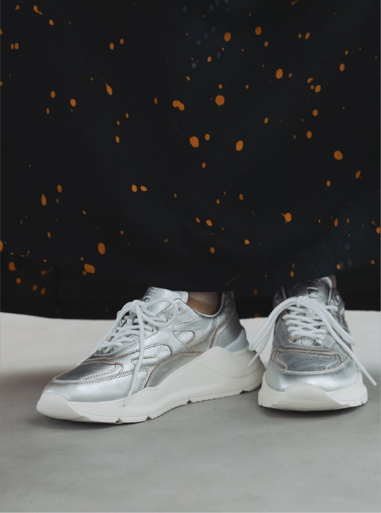 左:シルバーの上品な光沢がモード感のある1足。ソールやシューレースに白が入ることで、抜け感のあるこなれた印象に。