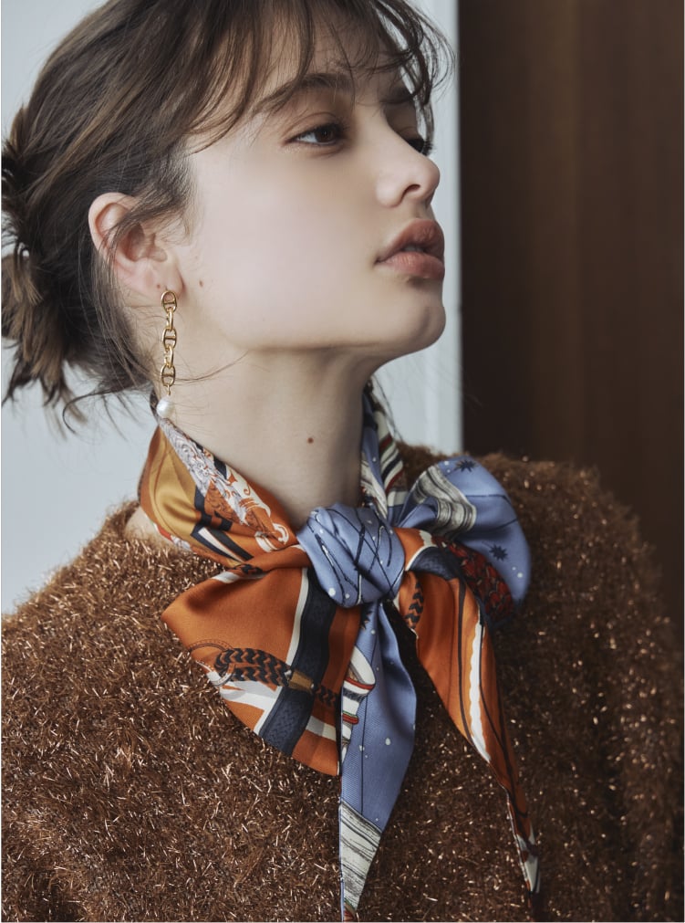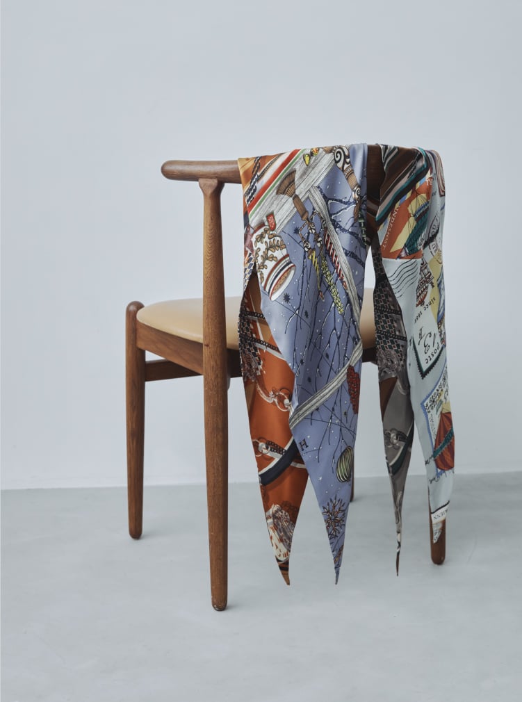 2つの柄がミックスされたダイヤ型のスカーフを、パリゴ限定の 組み合わせで2種類作成。[ 定番の馬具モチーフのプリント ] を基調に、[ 左:デンマークの温かくリラックスした家を感じられるような様子を描いたデザイン ] の組み合わせと、[ 右:ワールドトラベラーが訪れた旅先と収集したバルーンモチーフの切手を融合したデザイン ] の組み合わせ。巻いた時に違う柄が見えて、おしゃれで華やかになり、細長い形状なので、折りたたむ手間がなく巻きやすいスカーフです。