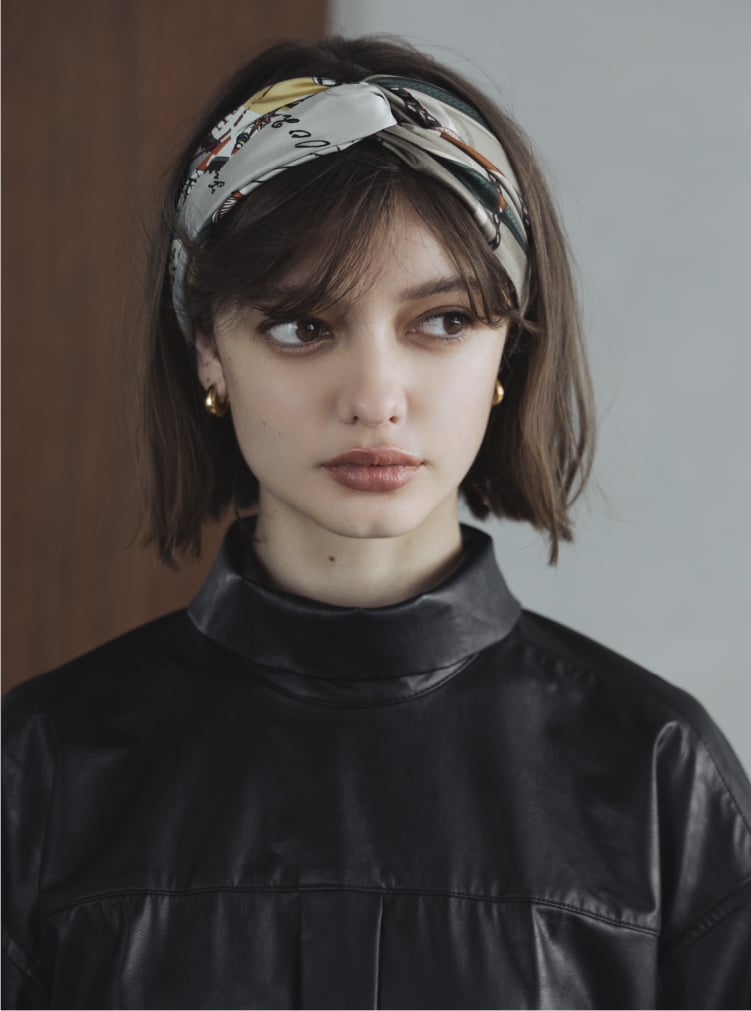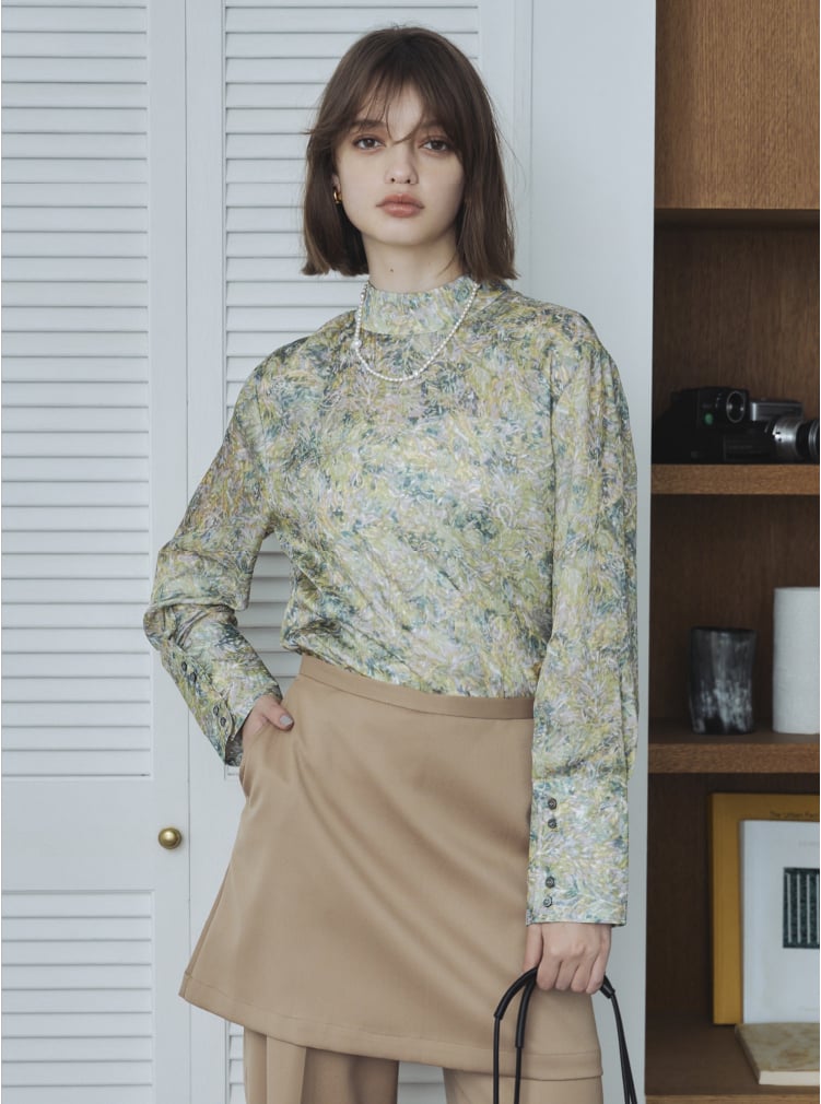 京都の染工場にて、オリジナル柄を手捺染で染め上げたオリジナル生地を、パリゴ限定のデザインにアレンジ。繊細に色が混ざり合う柄を気軽に取り入れられるよう、デザインはシンプルにおさえながら、コンサバティブにならないロングカフスや、首のラインにきれいに沿うハイネックなど、細かい部分にこだわりを詰め込みました。ボトムを選ばないジャストウエスト丈。