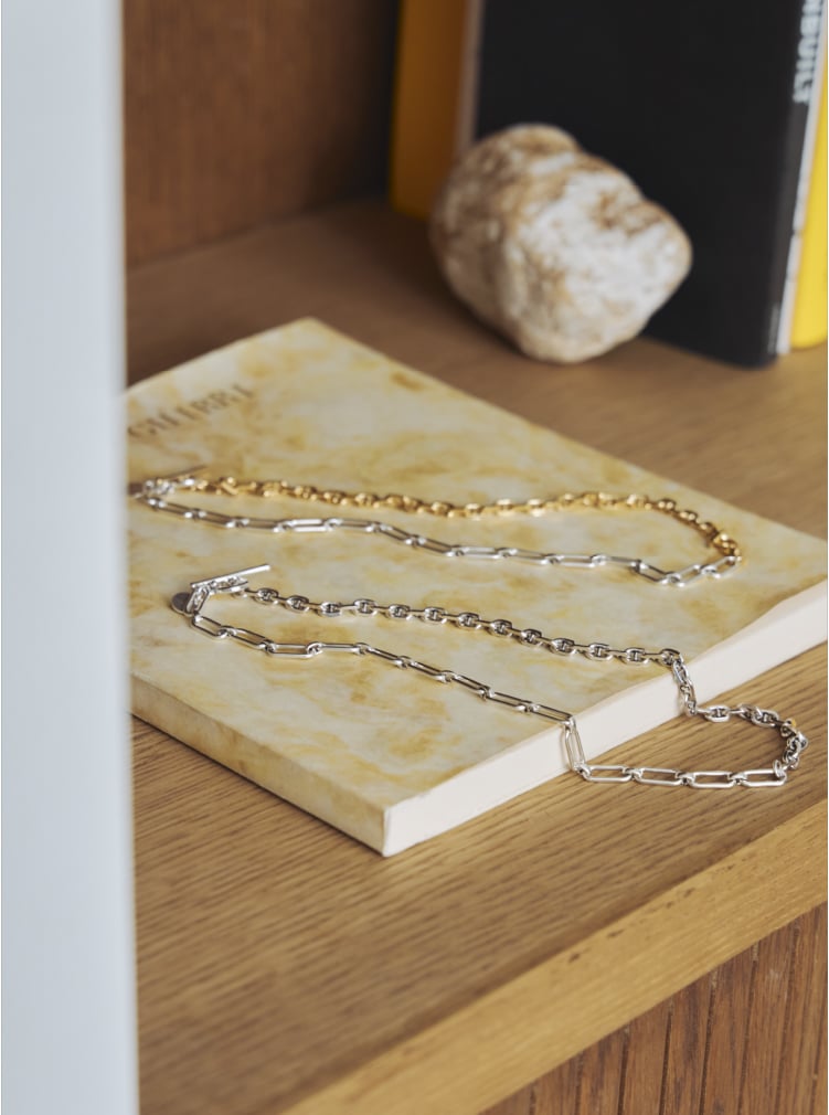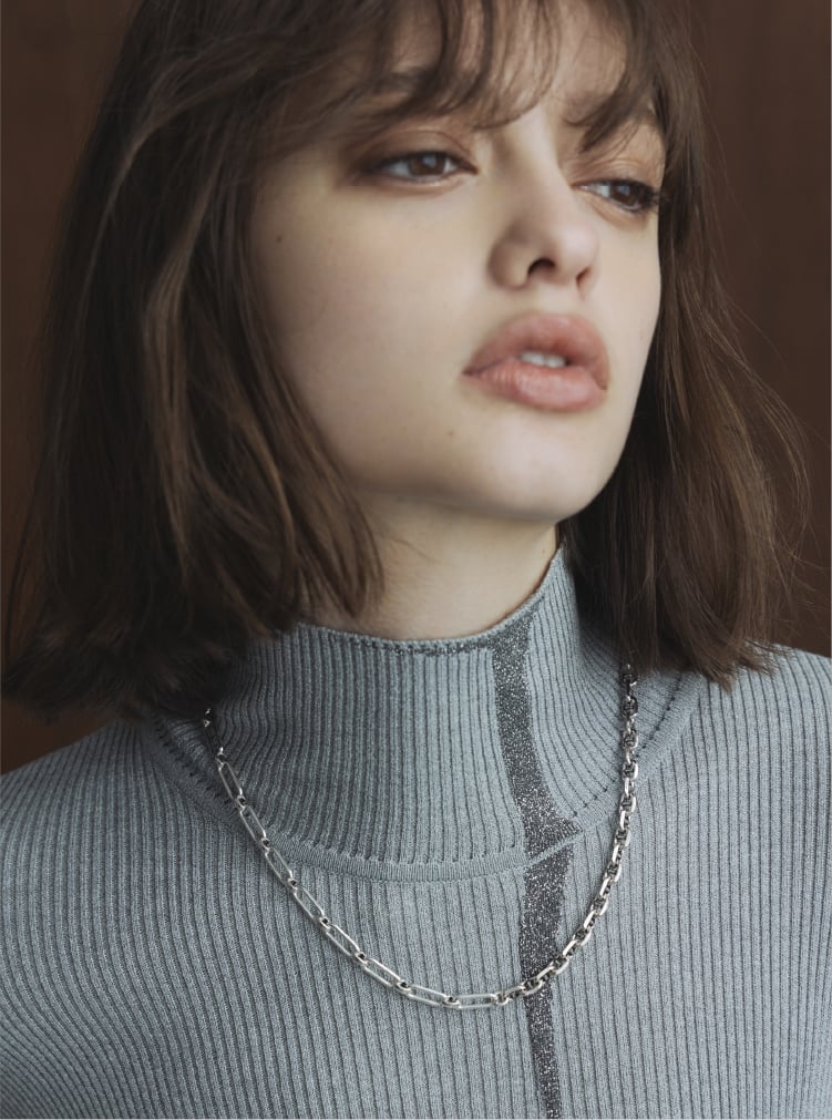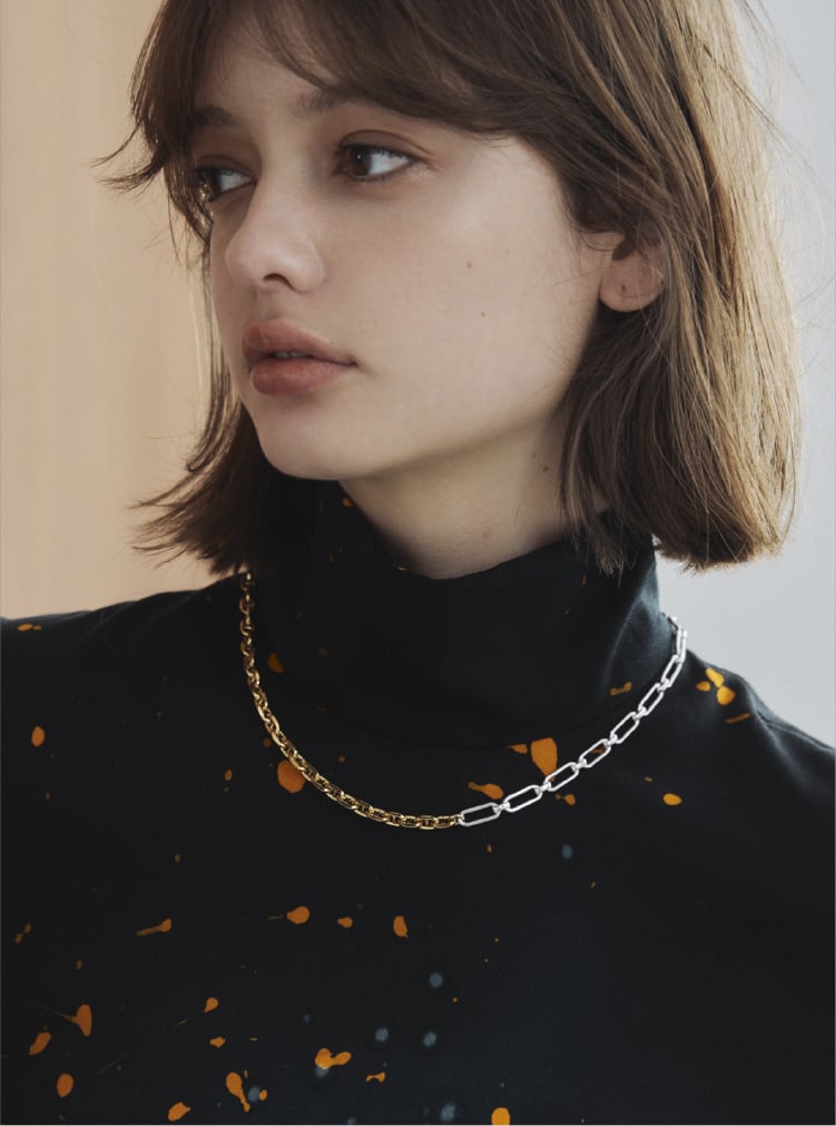 パリゴ限定のデザインネックレス。異なる2種類のチェーンを組み合わせ、短めに設計されたシルエットがスタイリングのアクセントに。存在感のあるデザインが視線を惹き付けます。”シルバー”と、”シルバー&ゴールド”のバイカラーの2色展開です。