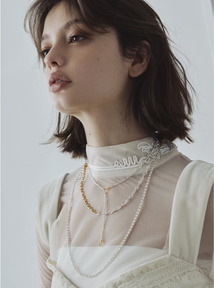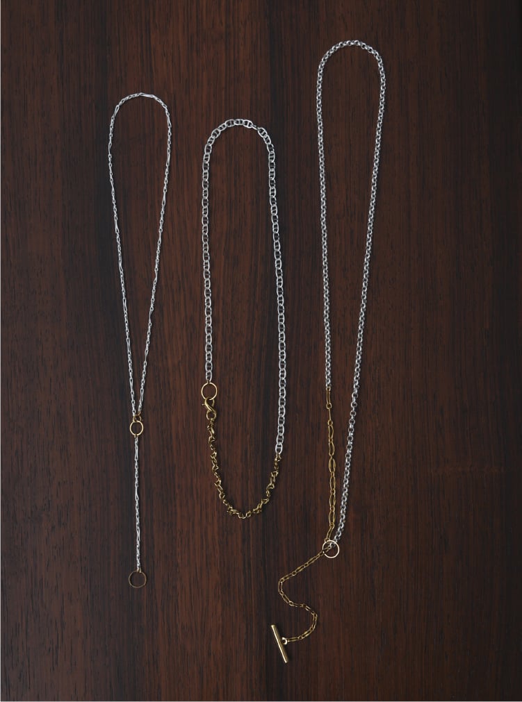 長さ調整が幅広く可能で、程良いボリュームのネックレスと、希少なデザインチェーンを使用したネックレスとをミックスし、3本重ねて着用した際にバランスが良くなる様、設計したネックレスです