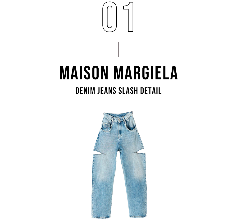 ラフにカットされた太腿のスラッシュ部分からのぞくほつれたデニムフリンジが目を引くデニム。ストーンウォッシュの色褪せ感のある加工や、ボリューム感のシルエットの強弱がかっこいいデザイン。