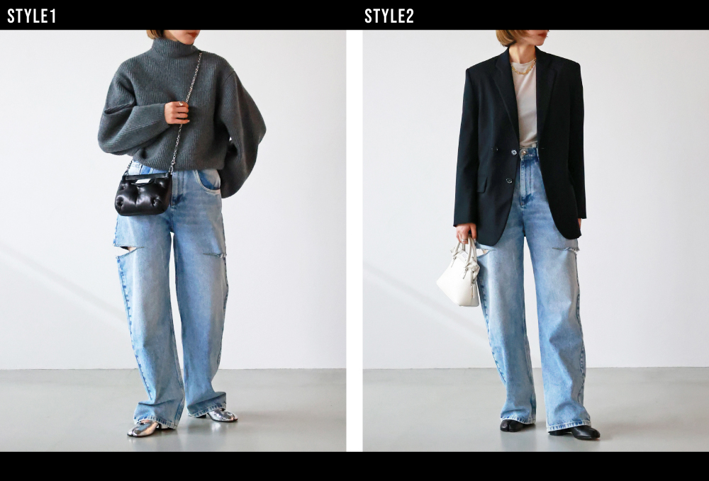 大胆なショート丈のニットに存在感のあるインナーをレイヤード。デニムのカーブシルエットがスタイリングをより際立ててくれる。遊び心がありながらも色と小物使いでバランスよくまとめたスタイリング。