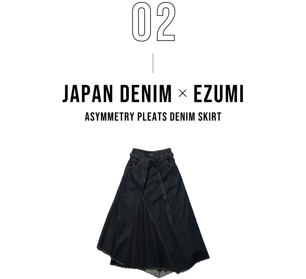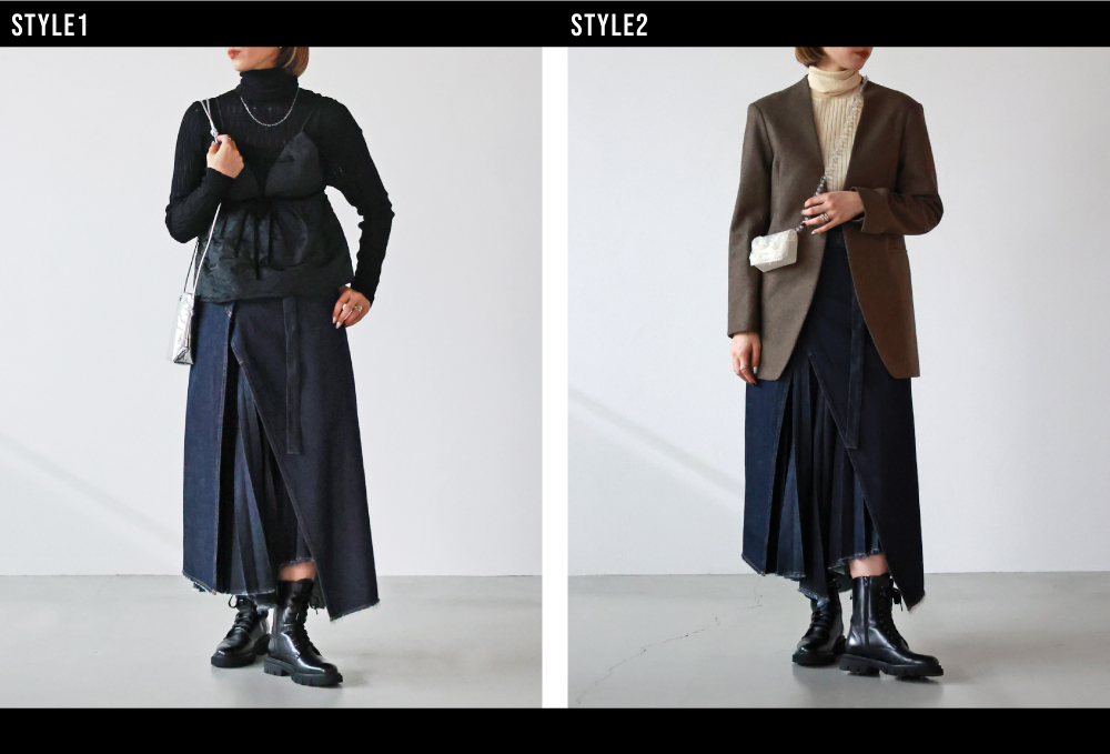 プリーツ使いが目を惹くデニムスカート。裾のアシンメトリーデザインは足元をシャープな印象に仕上げ、すっきりと都会的な印象で他にない主役級アイテム。