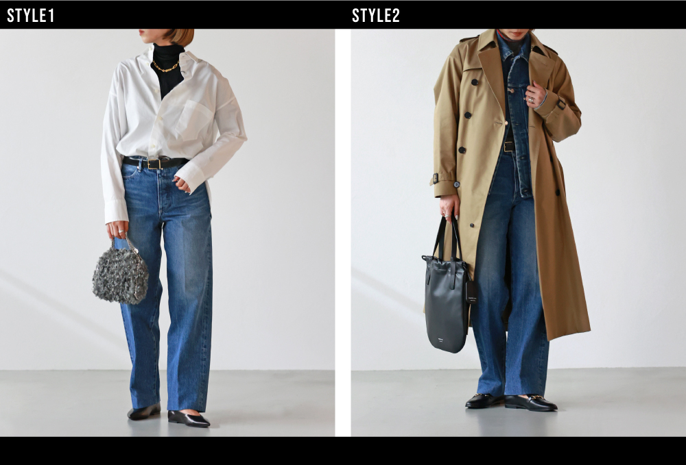 デニムonデニムのハンサムなスタイリングにトレンチを羽織ることでエレガントな雰囲気に。小物もレザーバッグとローファーをチョイスしてきれいめにまとめて。