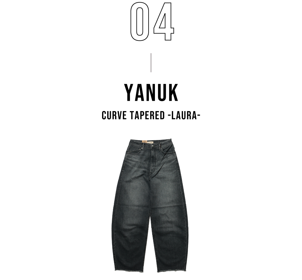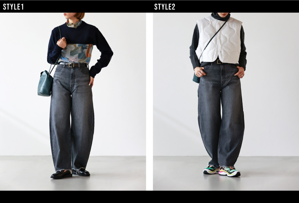 裾に向けて大きくカーブした作りのカーブテーパードデニム。腰付近はすっきりとして女性らしく、トレンド感を出しながら足を長くきれいに見せるシルエット。濃すぎず薄すぎない絶妙なグレーで、通年穿きやすい1本。