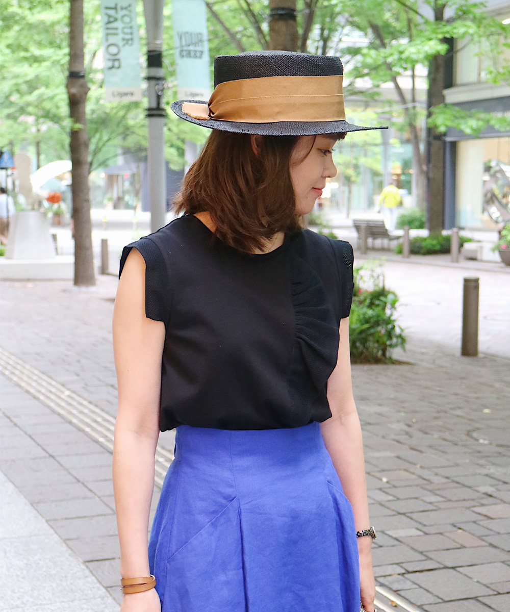 カットソーやシンプルニットなどをブラウジングして合わせて。