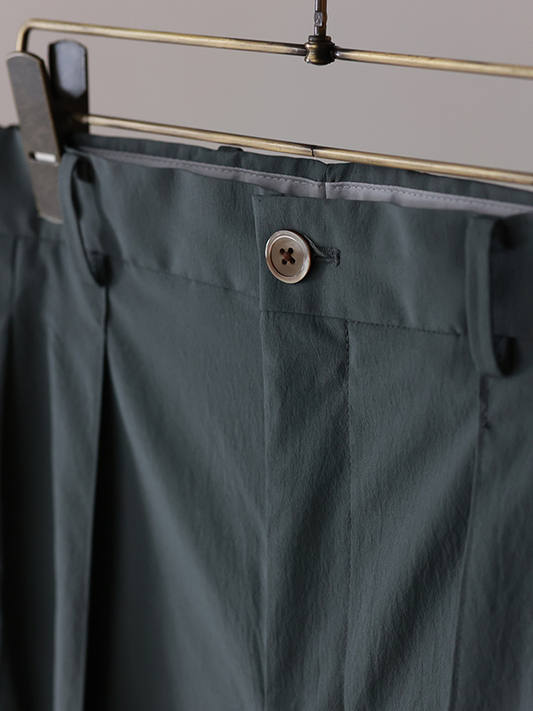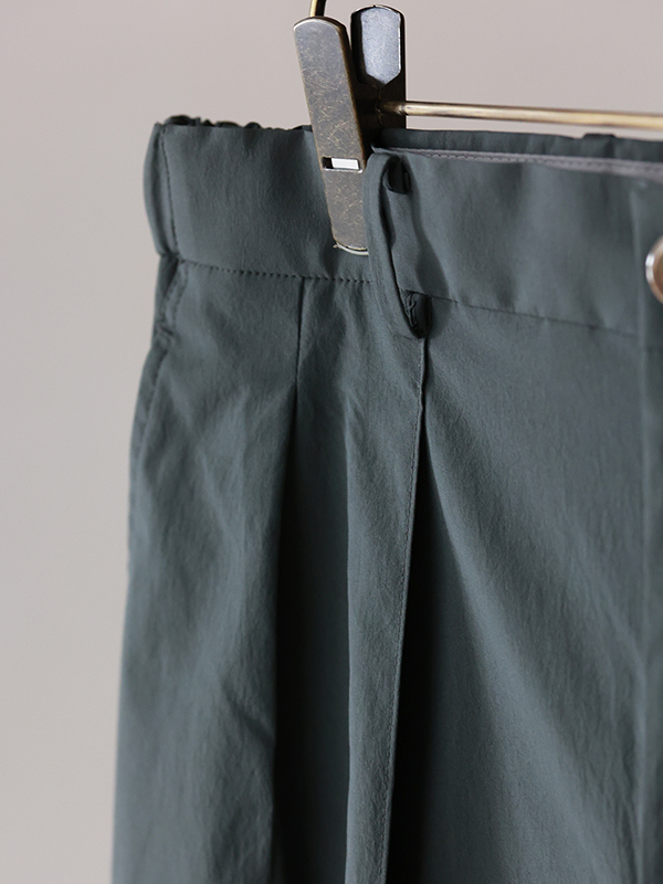 ゆったりとしたヒップ・ワタリから裾口に向けて、 テーパードのかかった美しいシルエットのシャーリングトラウザース。 美シルエットはそのままに、ドローストリングと脇ゴムにより、快適な穿き心地を担保しています。