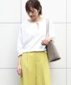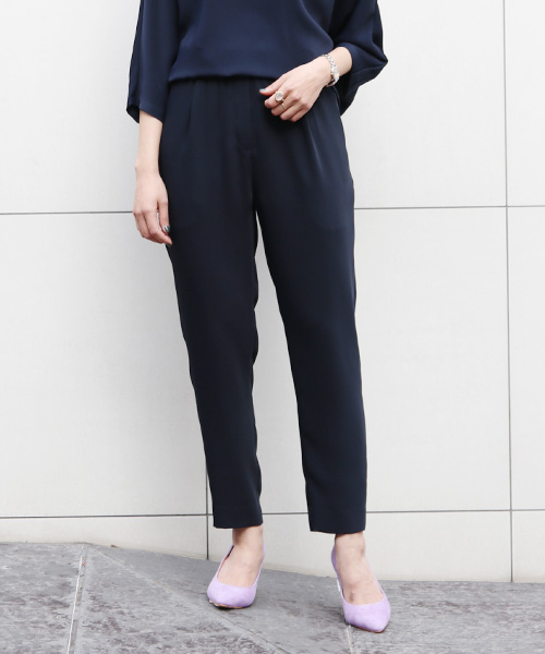 合わせたパンツは、PARIGOTのヒットアイテム「-3kg美脚テーパードパンツ」。明るめブラウスを合わせて、入園・入学式にも。トップスを選ばないシンプルな一本は、デイリーにはもちろんオフィススタイルにも活躍してくれます。
