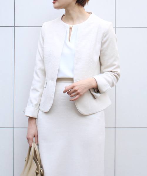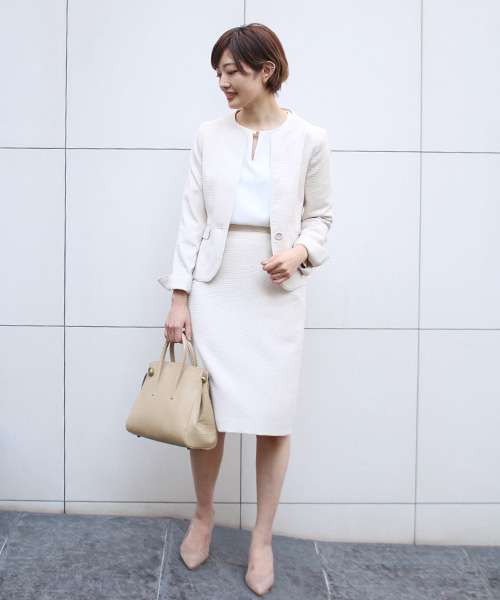 コンサバな印象できちんと感を演出してくれるツイードのセットアップ。インナーにホワイト、小物にベージュを選び、明るめのワントーンでまとめて。