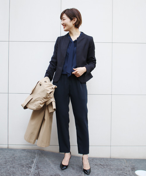 きらきらと反射する糸が織り込まれたジャケットで、普段使いのパンツをドレスアップ。ジャケットに合わせてブラウス・パンツもネイビーをセレクトし、バランスのとれたスタイリッシュな着こなしに。