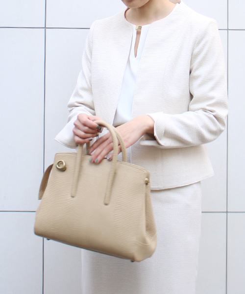 佇まいが美しいJOLIE LIZARDは、持つだけで品の良いコーディネートに仕上げてくれます。ブランドオリジナルの真鍮パーツがアクセントに。リザードの型押しを施した牛革は、程よいフォーマル感でデイリー使いにも。