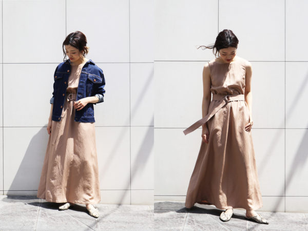 ナチュラルなリネン素材とウエストベルトでクールな印象に。