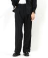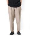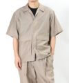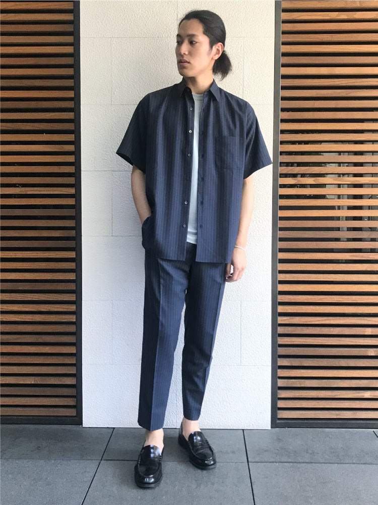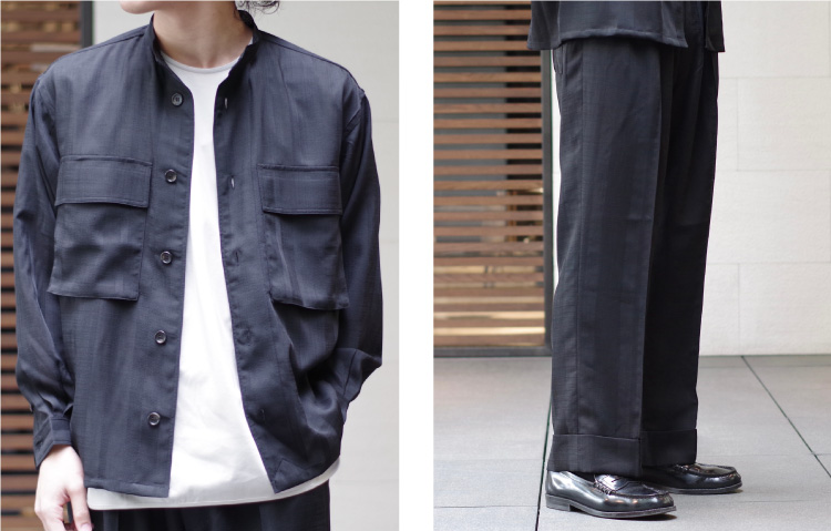 オープンカラー型で 1番上のボタンまで留めてアレンジできる半袖シャツジャケットと、定番の斜めの深いプリーツが特徴のペグトップイージーパンツ。