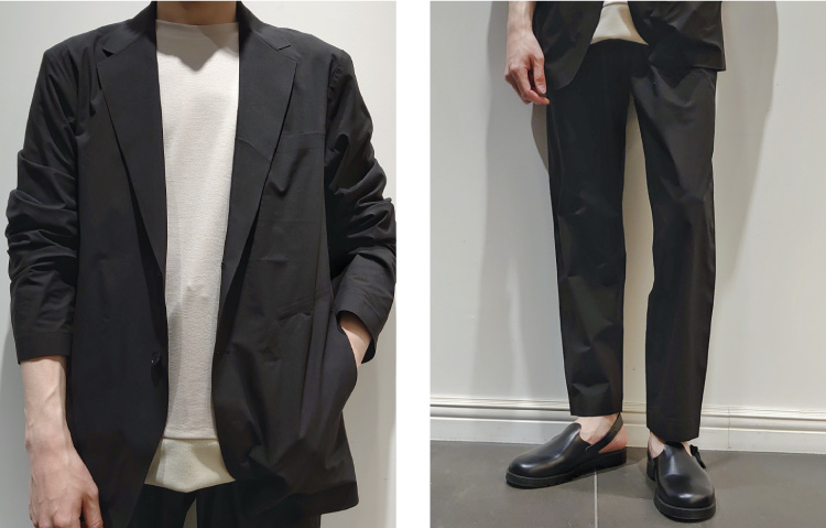 無駄なデザインを省くことでクリーンで上品な印象に仕上げた超軽量のジャケットとパンツのセットアップ。