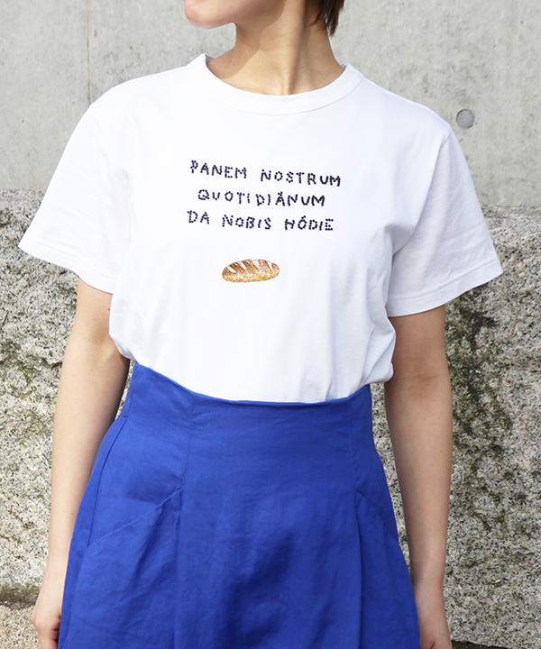 パンの絵柄と古いラテン語の言葉“日々の食事に感謝する”をビーズ刺繍。ポップなデザインが心くすぐります♡