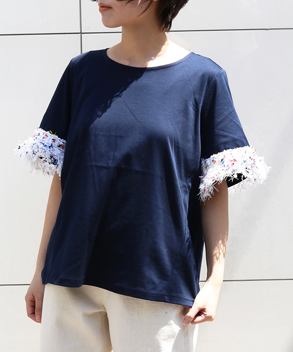 色とりどりのフリンジを贅沢に袖口に施したTシャツ。Tシャツの様に気軽に着れるアイテムながら、他にないエレガントな存在感が魅力。