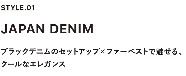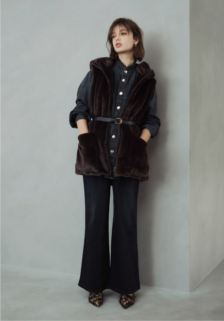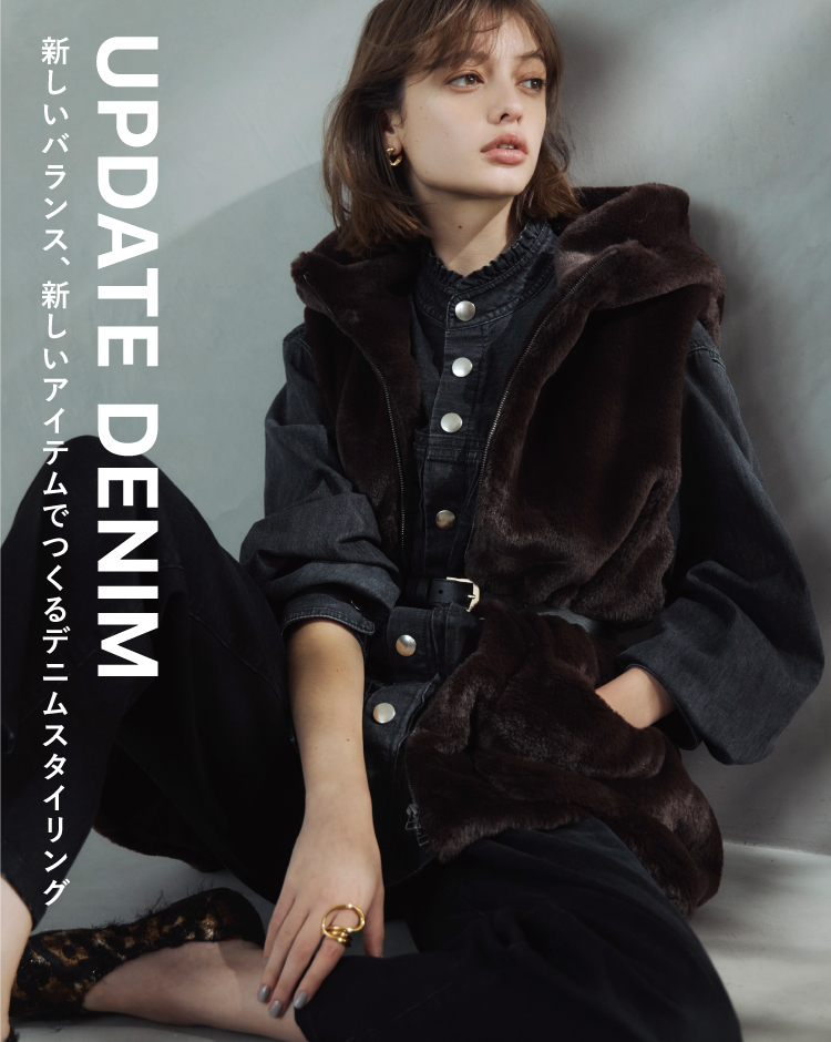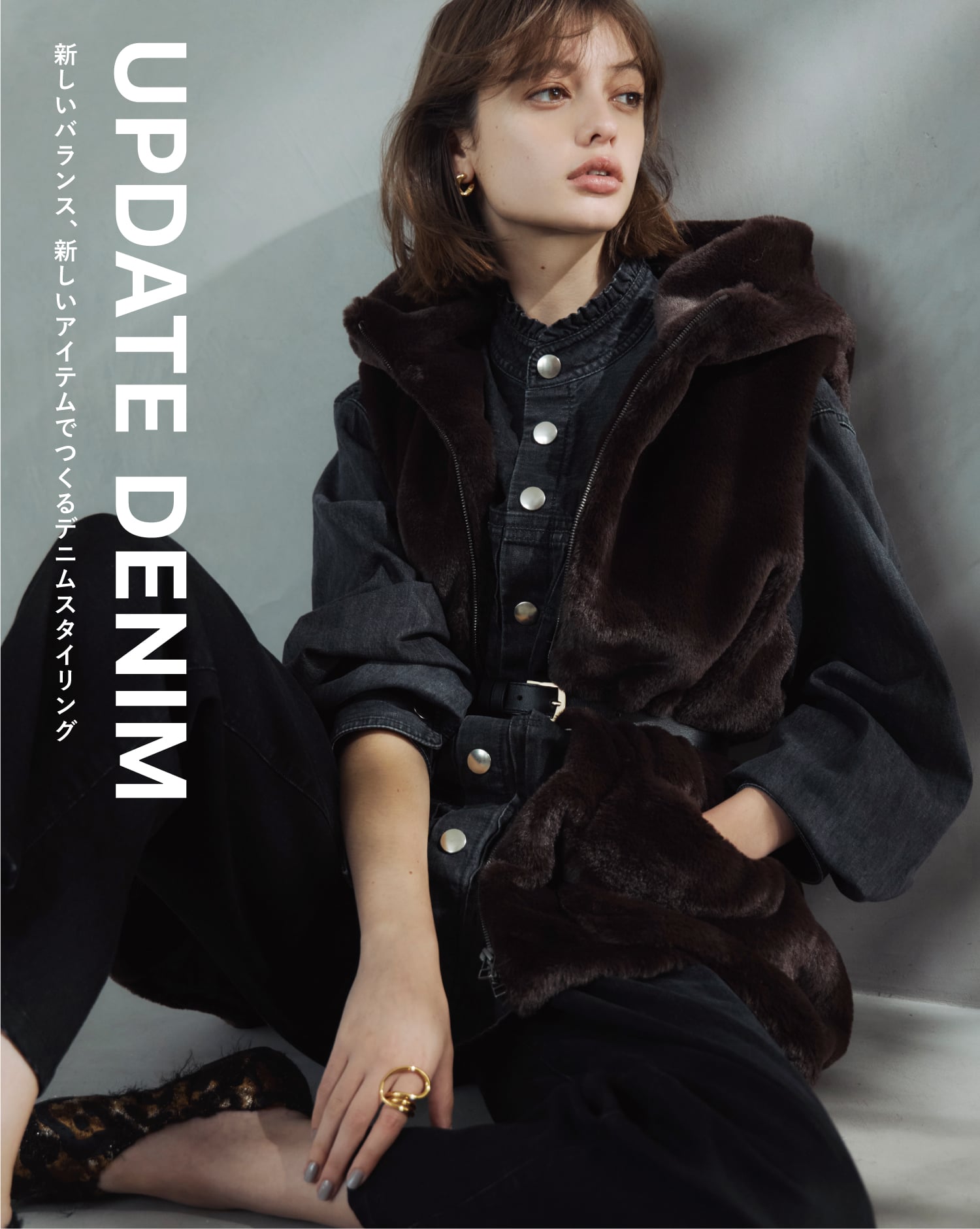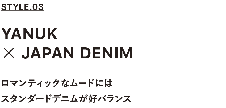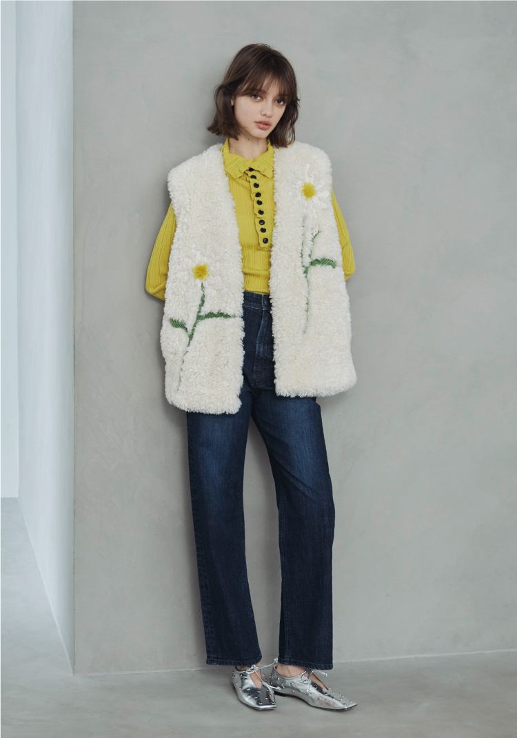 PANTS / ¥29,700 : YANUK×JAPAN DENIM – KNIT / ¥39,600 : near.nippon VEST / ¥70,400 : MUVEIL SHOES / ¥42,900 : PIPPICHIC