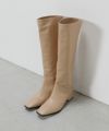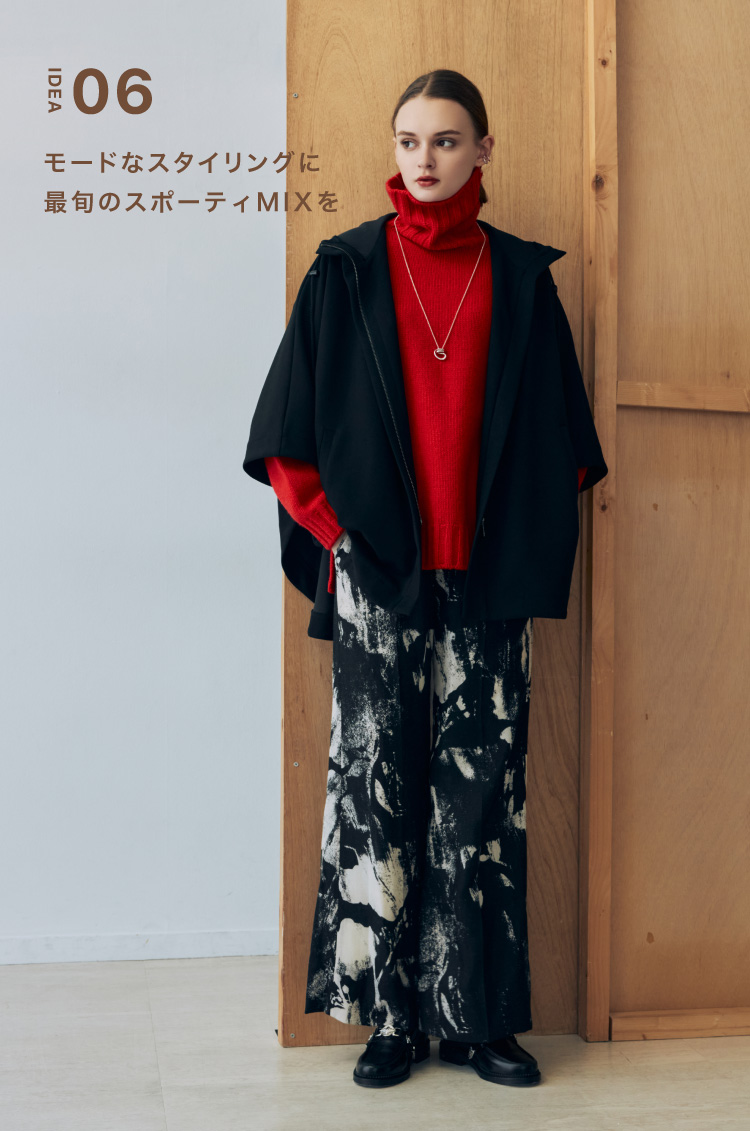 リラクシーでスポーティなダンボールニット素材のアウターにはピリリとしたモードエッセンスを加えてクールな装いで今っぽく。