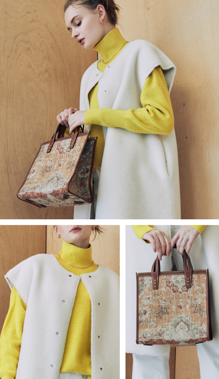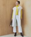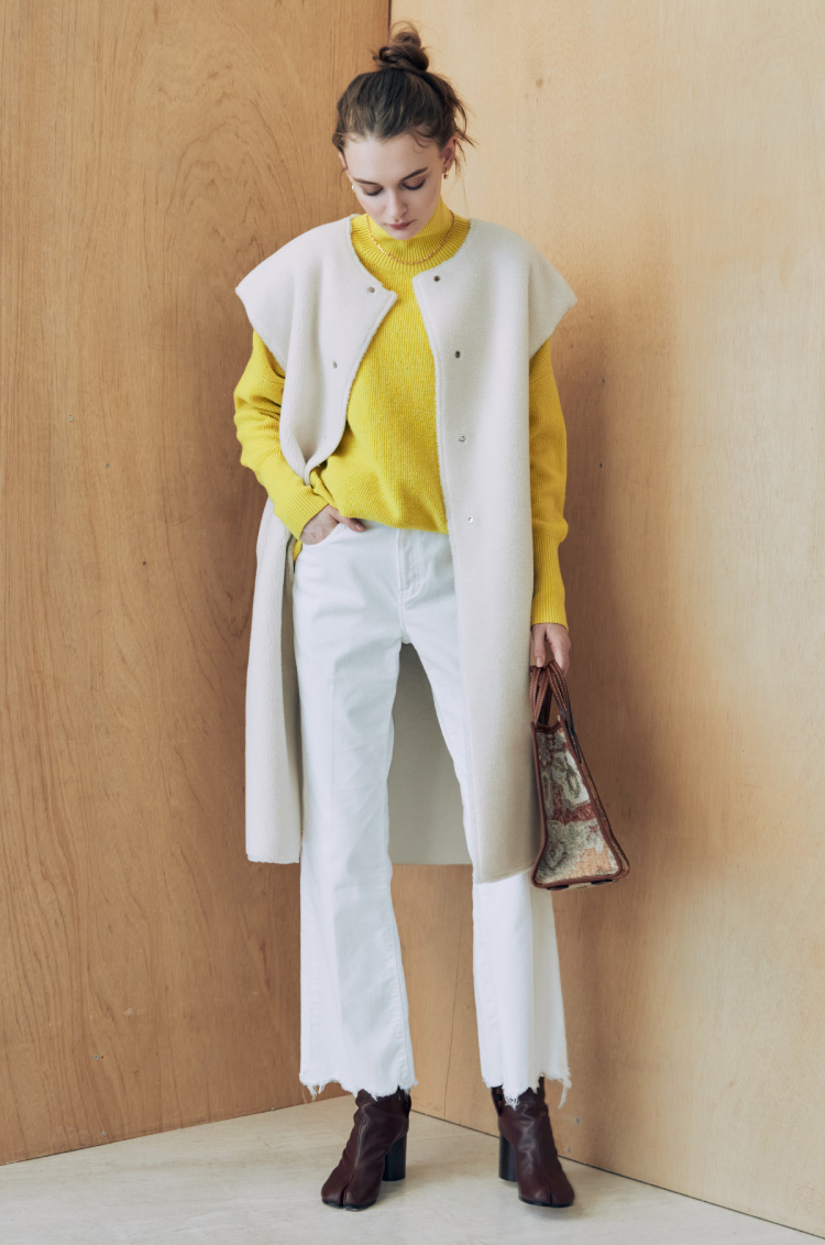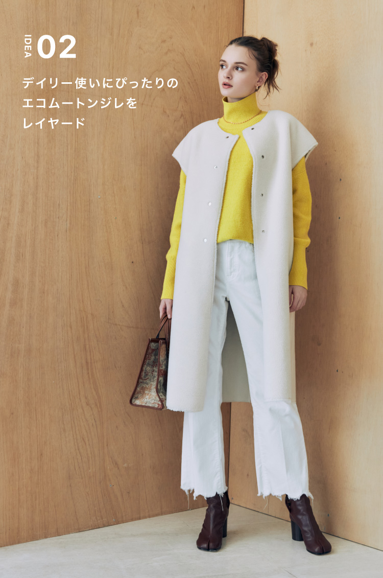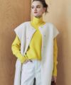 ボアとスエードの表裏で異なる表情を楽しめるリバーシブルのエコムートンジレをポイントに、イエローを挿し色にしたプレイフルな大人カジュアルを演出。