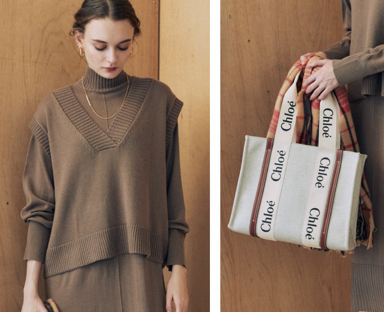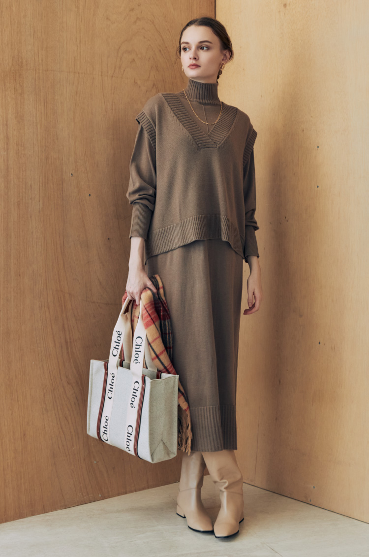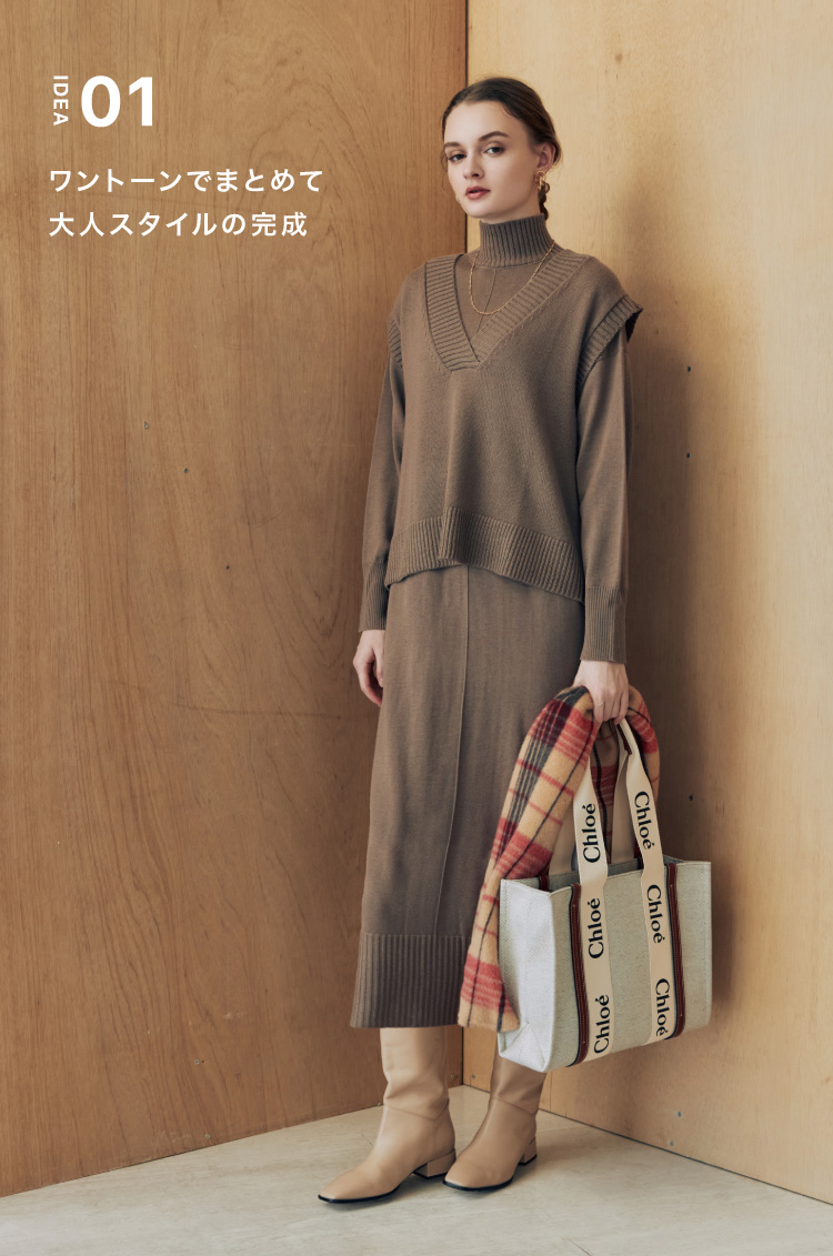 ワンピース&ベストがセットになった、3WAYで着こなしが楽しめる優秀ニットアイテムを主役に。すっきり見えするハイゲージニットには小物でボリューム感をプラス。