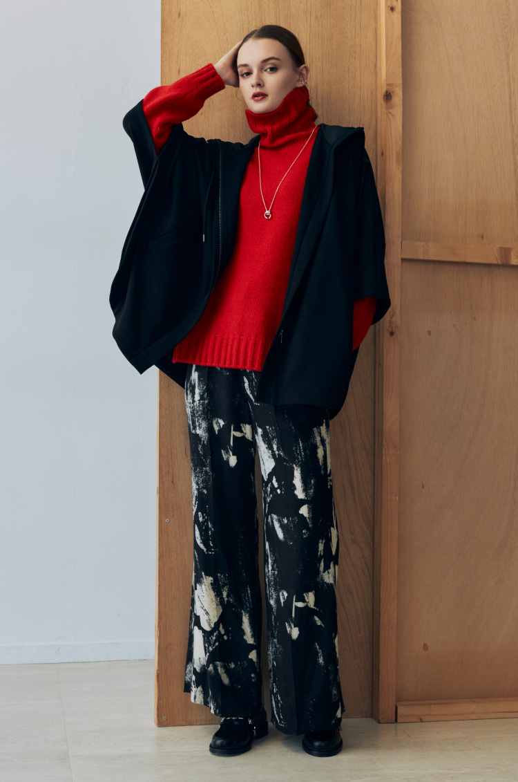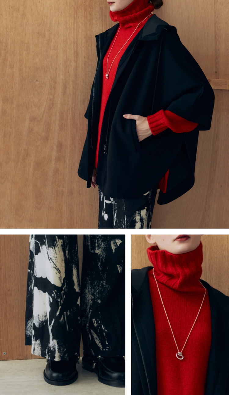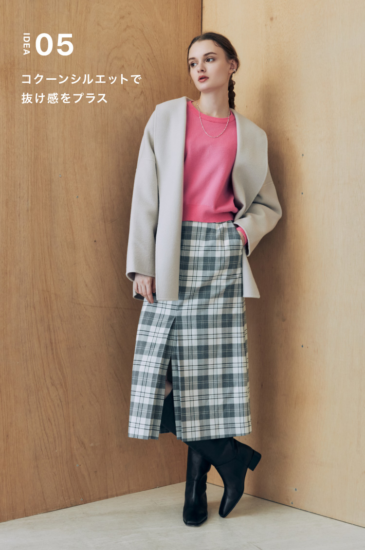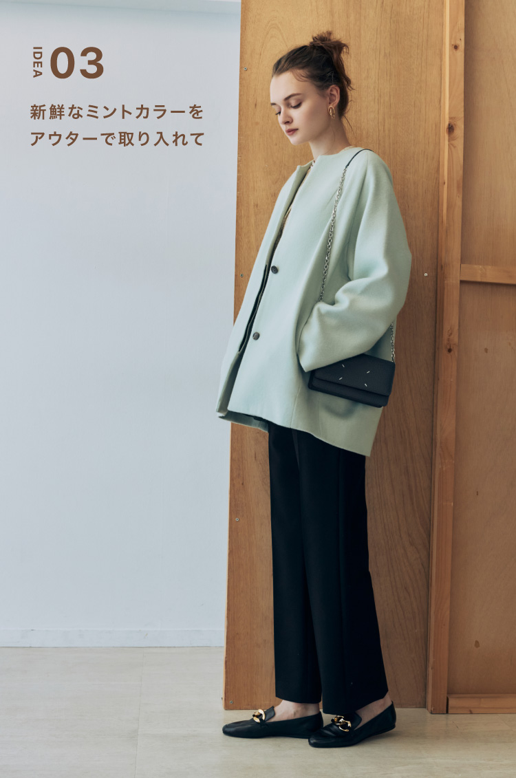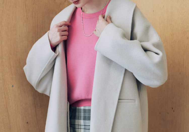 落ち着きがちな冬のスタイリングには、あえてカラーアウターにチェレンジ。しなやかで上質なウールを使ったコートは、風合いを出した色合いもポイント。キーネック風デザインで顔周りに抜け感をプラス。