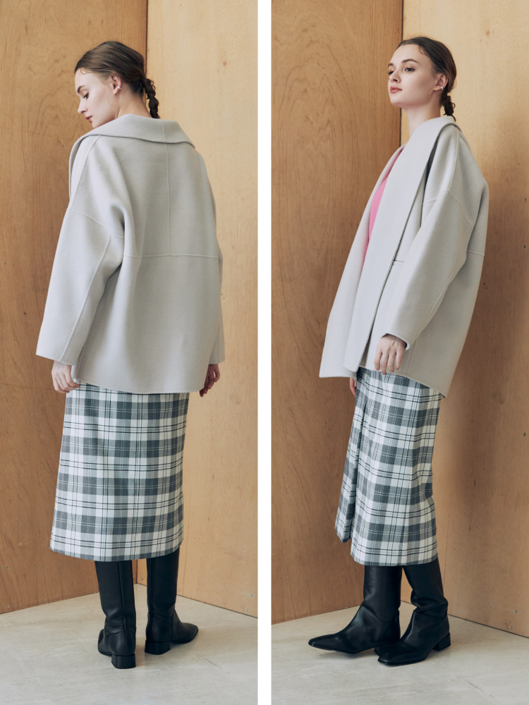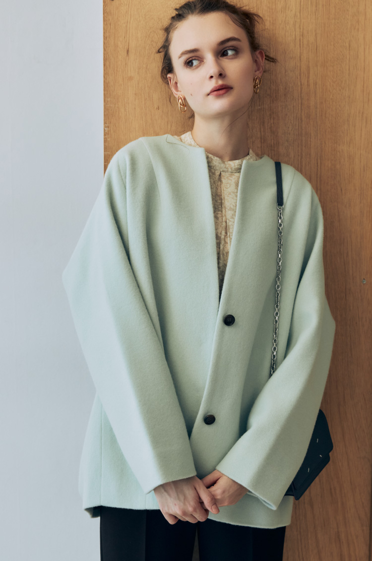 ショールカラーが女性らしく柔らかい雰囲気を演出。コクーンシルエットで、さらりと羽織るだけで抜け感のある印象に。暖かさと軽さが特徴で、お出かけの足取りも軽やかに。