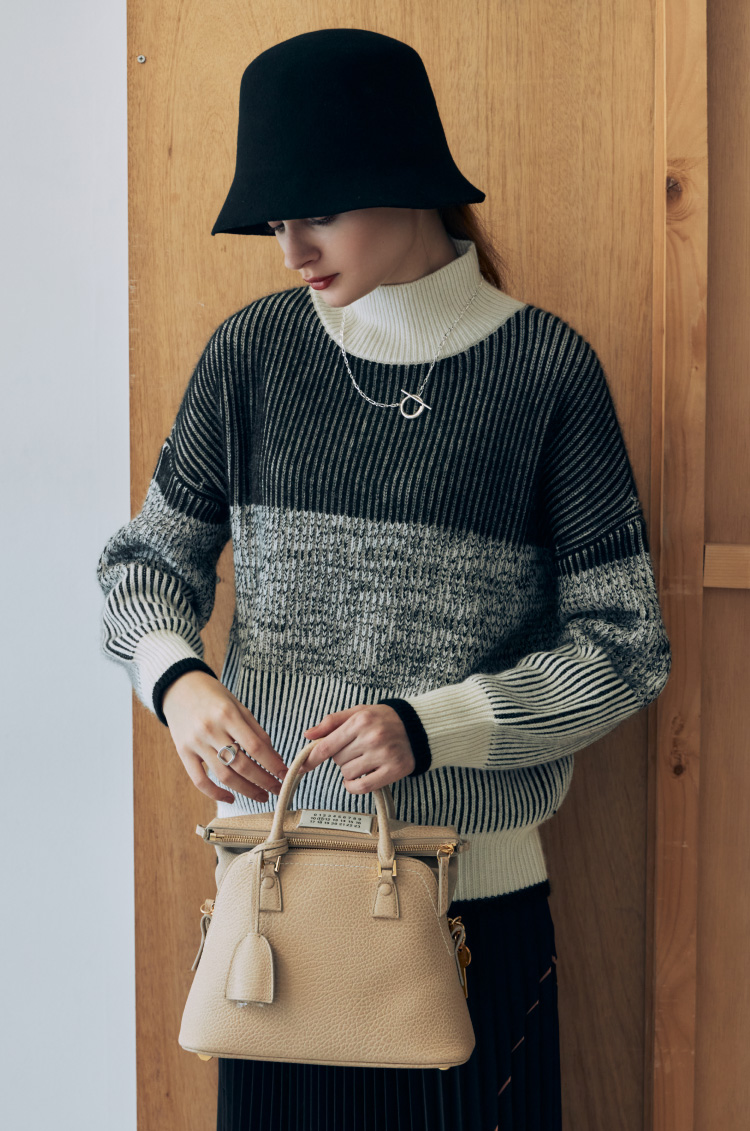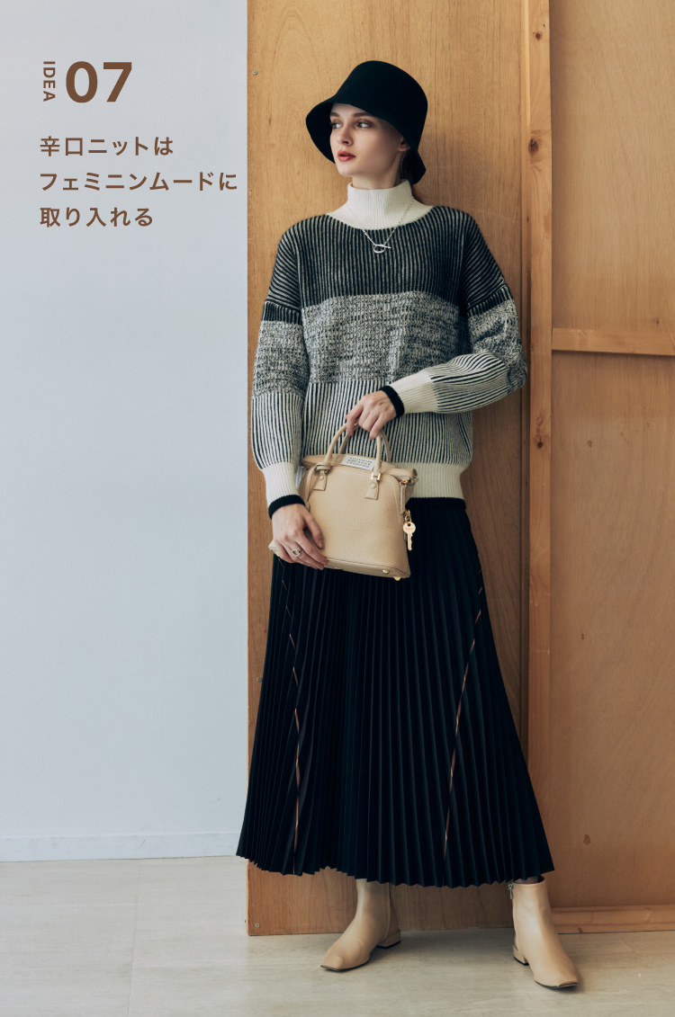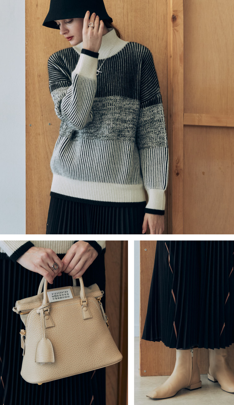 モード感漂うモノトーン配色がキャッチーなニットには、プリーツスカートでフェミニンさをプラス。小物をベージュにまとめて女心を忘れずに。