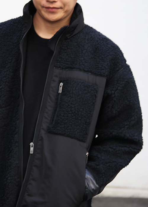アウトドアウエアから着想を得て3種の素材を大胆に切り替えた、スタンドカラーボアコート。襟、袖口、裾と、左身頃に異なる光沢感のサテン生地を使用したデザインです。フロントはダブルファスナー仕様。実用的なファスナー付きハンドポケットと胸ポケットも嬉しいポイント。