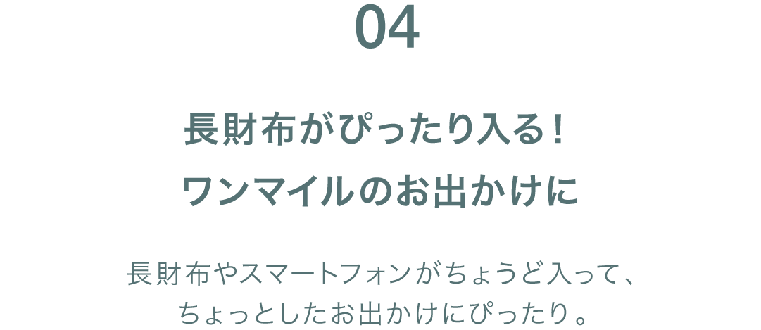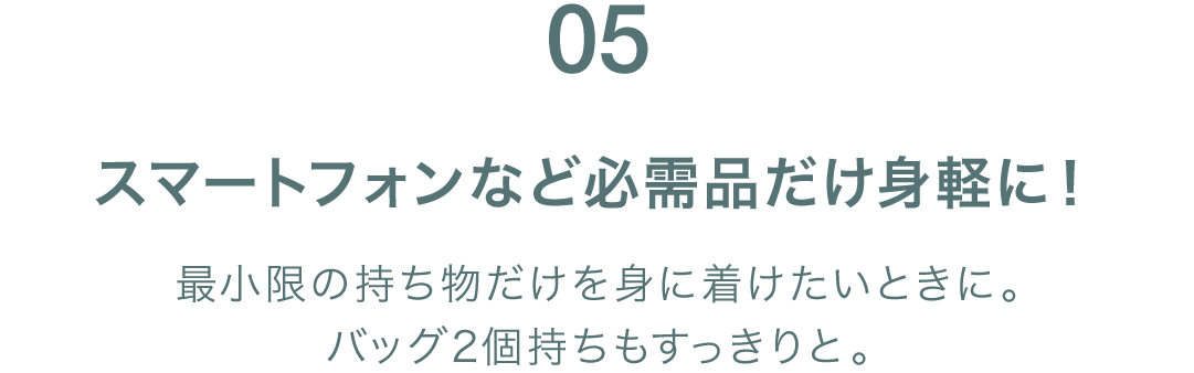 スショルダーストラップは調節可能で、スマートフォンや財布などを持ち運ぶのに便利なコンパクトフォルム。ちょっとしたお出かけにぴったりです。シンプルで年代を選ばず、軽量なのが魅力。スマートフォンとミニ財布が入るので、身軽にお出かけしたいときに最適なバッグです。