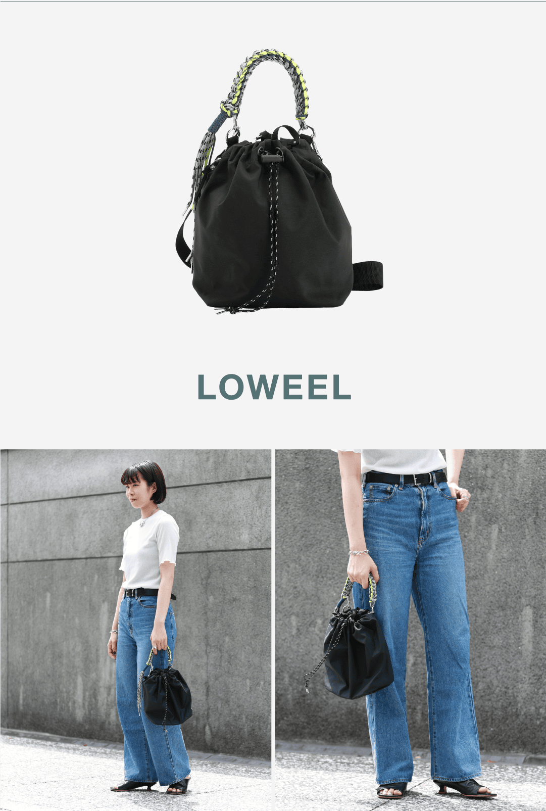 口元は紐で絞れる巾着タイプなので中身が見える心配がなく、使い勝手も◎。付属のショルダーをつけて、2WAYで活躍するバッグです。