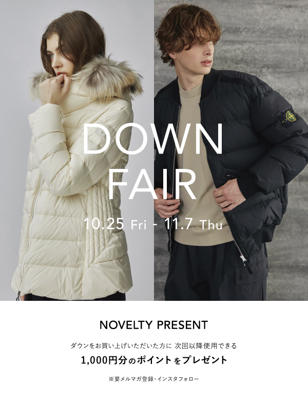 2024年10月25日(金)~2024年11月7日(木)まで、ダウンアイテムをご購入いただいたお客様は “メルマガ登録 or インスタグラムのフォロー” で次回以降お買い物でご利用いただける1,000円分のポイントをプレゼント!