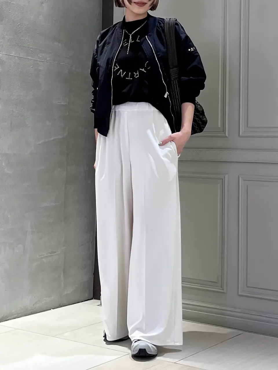 カジュアルな印象の強いMA-1も、TATRASの手にかかれば品のある表情に。ハイウエストのスラックスと合わせたクリーンな着こなしにも無理なく馴染みます。