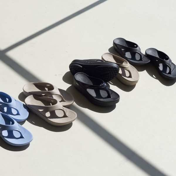 2011年にマサチューセッツ州のコハセットでスポーツ選手やトレーナー、大手シューズメーカーの製品開発に携わるベテランチームにより、2 年半の歳月をかけ開発されたリカバリーシューズブランド。OOFOS製品に使われている特殊素材 OOfoam は、前進力を生む事を目的とした一般的な EVA 素材のミッドソールと異なり、衝撃の反発を 37% 抑えることができ着地による足裏への衝撃を軽減することができる。そのため膝、腰、背中にかかる負担を軽減でき、また人間工学に基づいて設計されたフットベットにより、足を優しく包み込み、土踏まずをしっかりサポートしている。