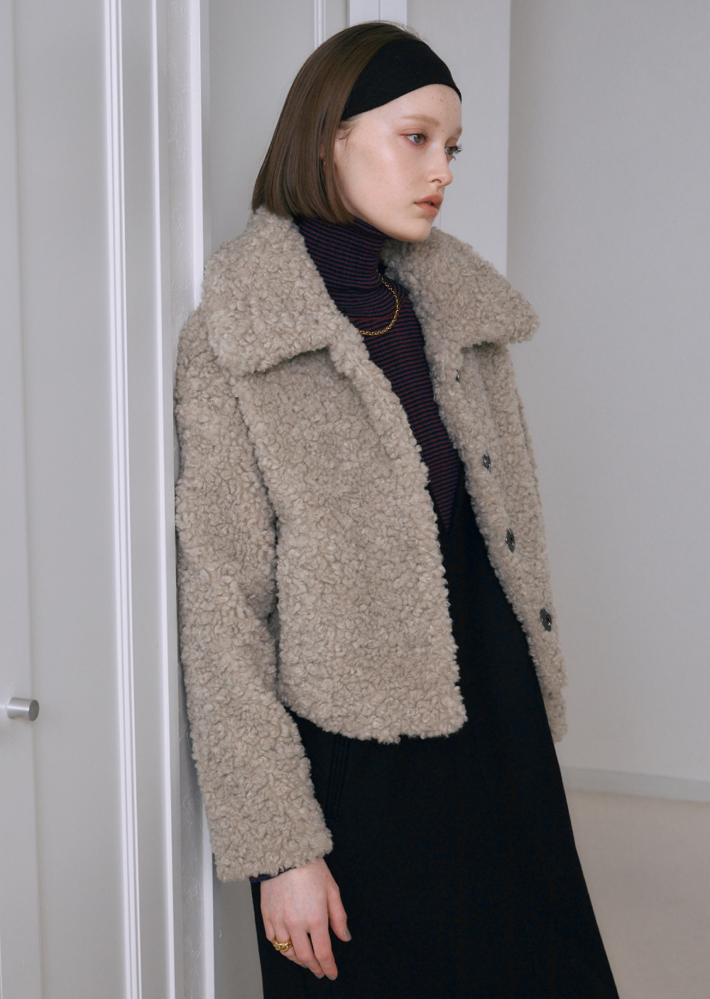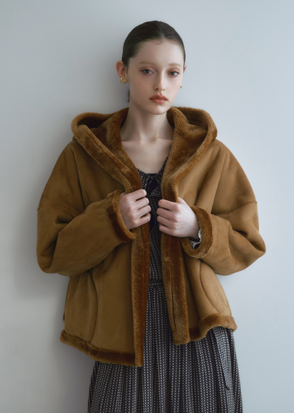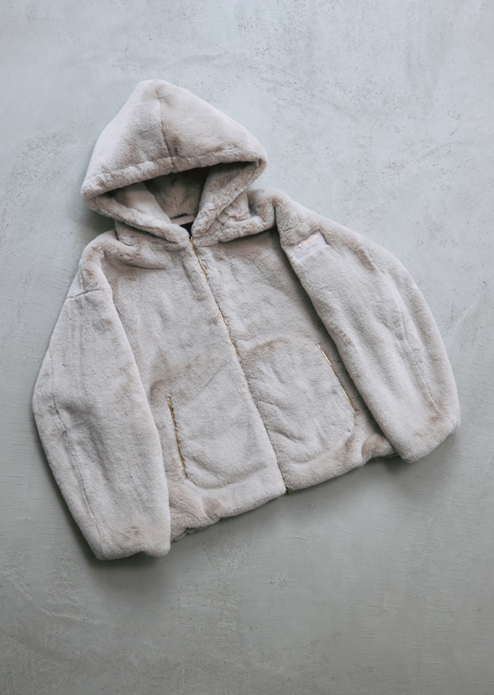 リサイクルポリエステルを使用したフェイクファー素材で、発色の良さと繊細なタッチが特徴。ボリュームがありながら軽い着心地。