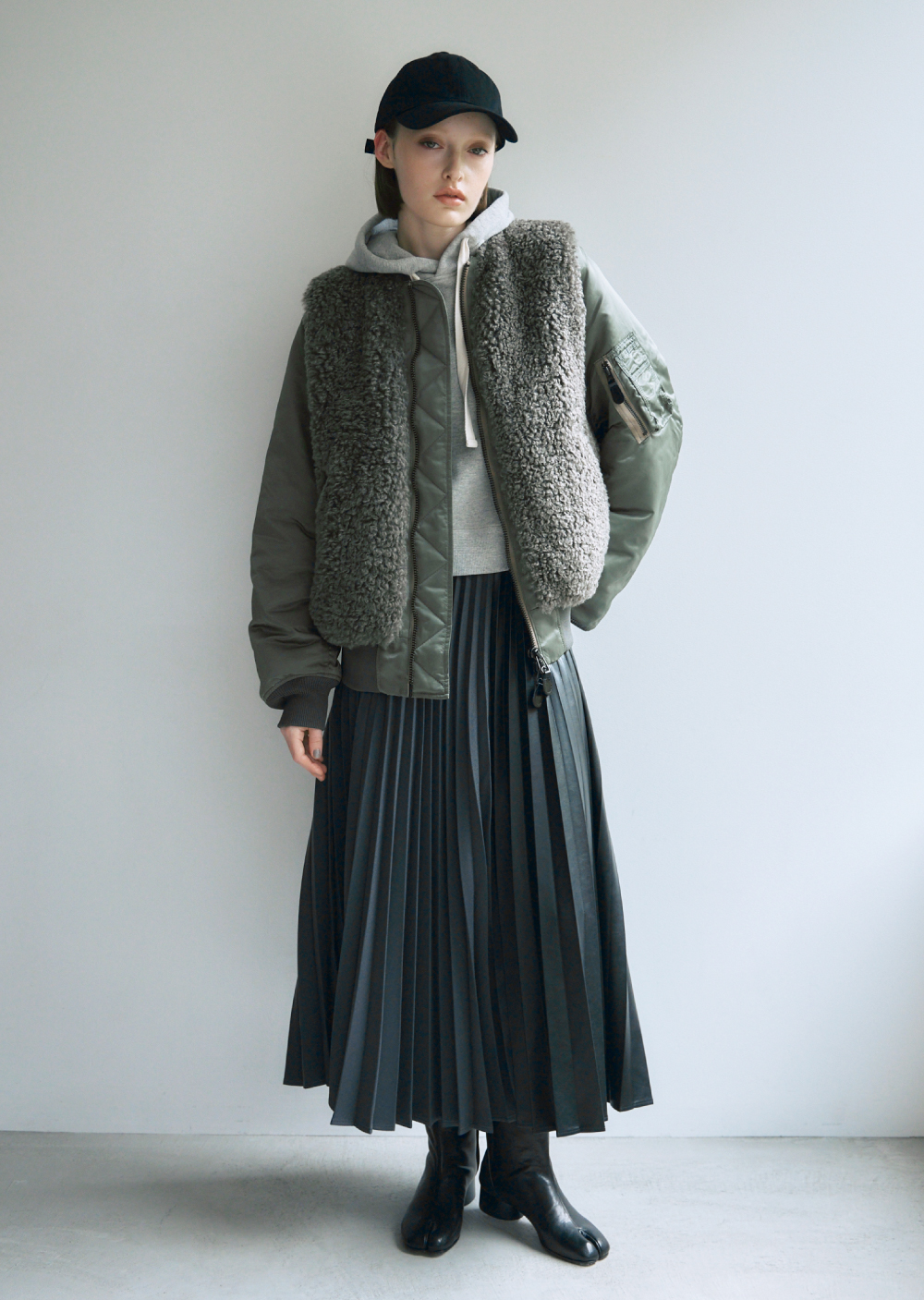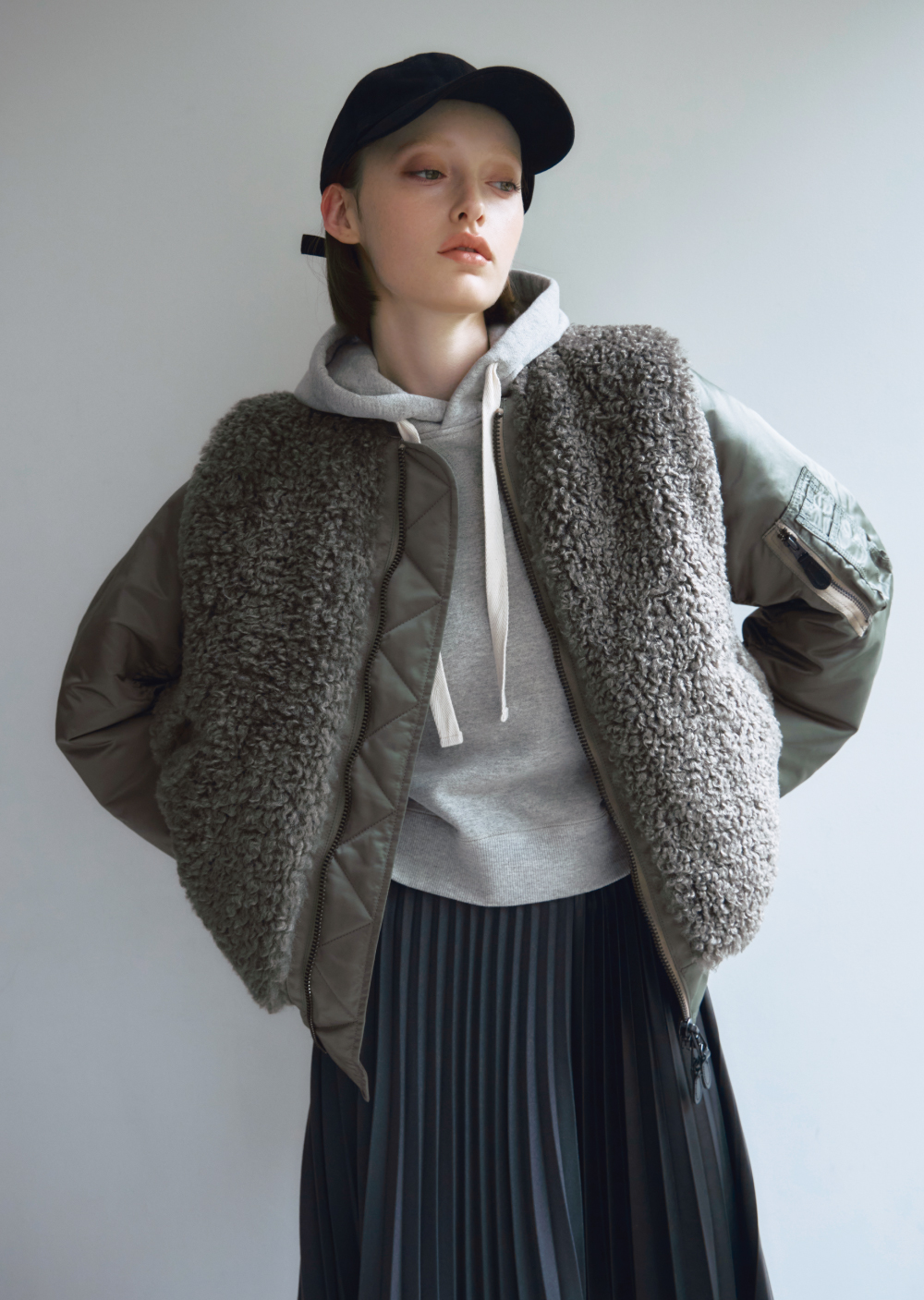MA-1 着想のビッグシルエットブルゾン。身頃のファーと中綿で保温性高く、カジュアルからモードまで自在に着こなせる。