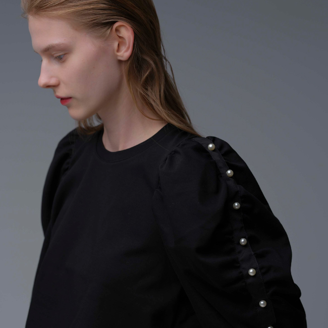 テーマ「強さとエレガンスを併せもつ女性のための服、シルエットやディテールを大事に上質で洗練された着心地のいい服」を軸に、フリルやリボン使いなどフェミニンな要素が強い「ラウラ」よりも、上質素材にこだわり、ダークトーンでシックな印象に仕上げています。