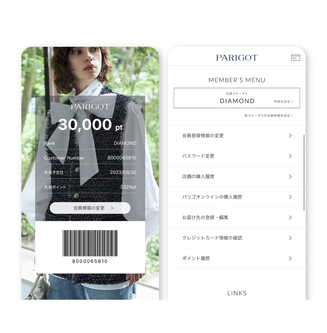 パリゴメンバーズにご登録いただければ、お店でお買い物をする際に会員証としてご利用いただけます。そのほか、会員特典やご購入履歴などもチェックいただけます。貯まったポイントは店舗とオンラインでご利用可能です。
