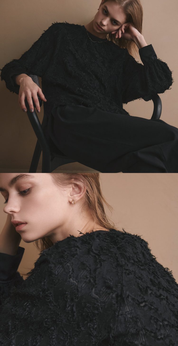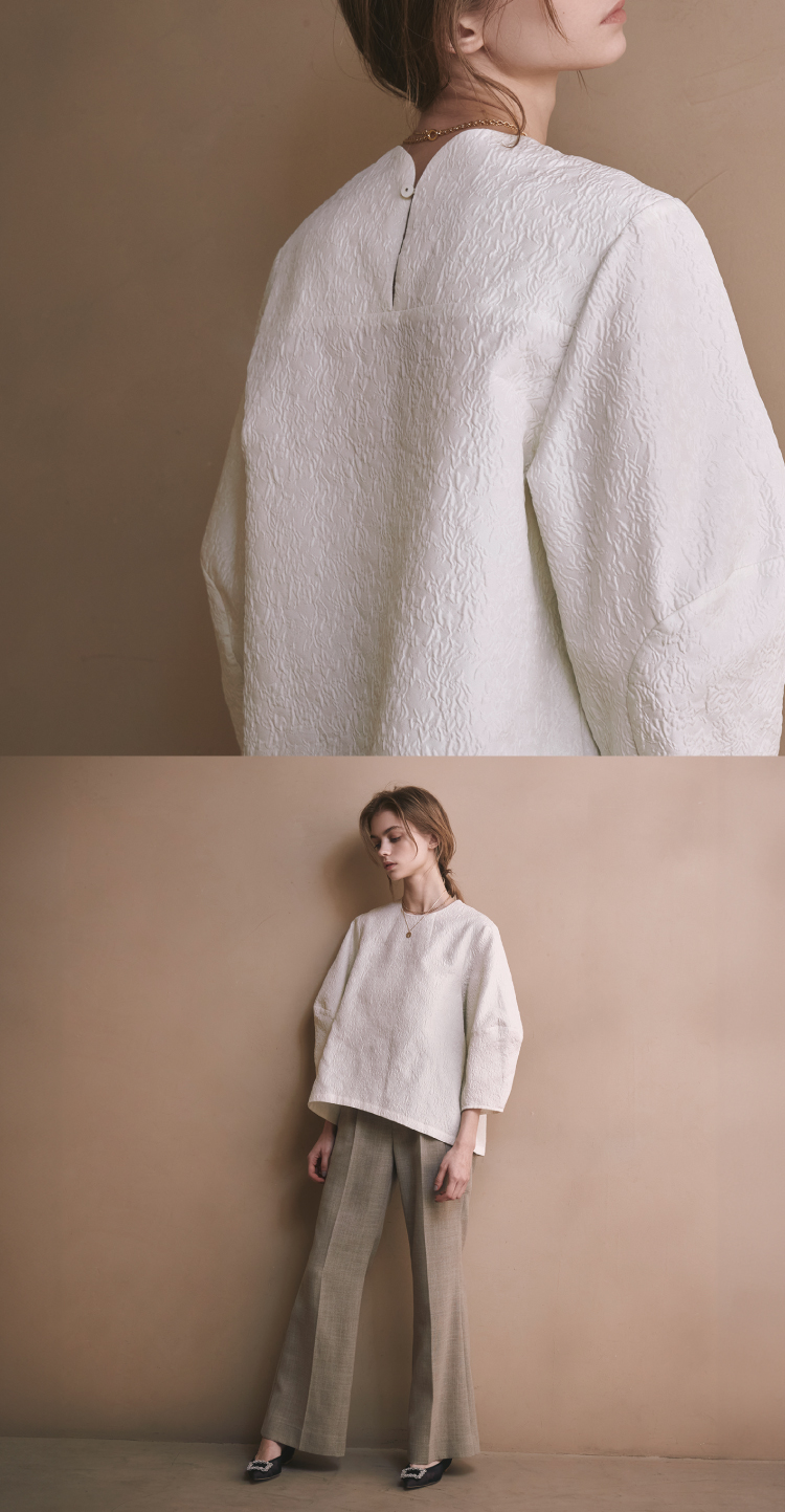 凸凹のある表情がユニークな膨れジャガード素材を使用したブラウス。ハリのある素材感で、立体的に仕上げた丸いフォルムが際立つ。